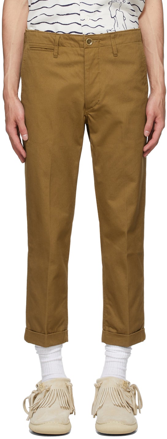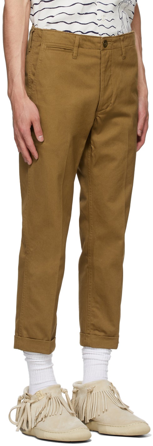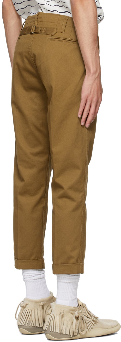 Tapered cotton twill trousers in brown. Mid-rise. Four-pocket styling. Belt loops at waistband. Central creases at front and back. Rolled cuffs. Cinch strap at back waist. Button-fly. Antiqued brass-tone hardware. Supplier color: Khaki 100% cotton. Brand: Visvim