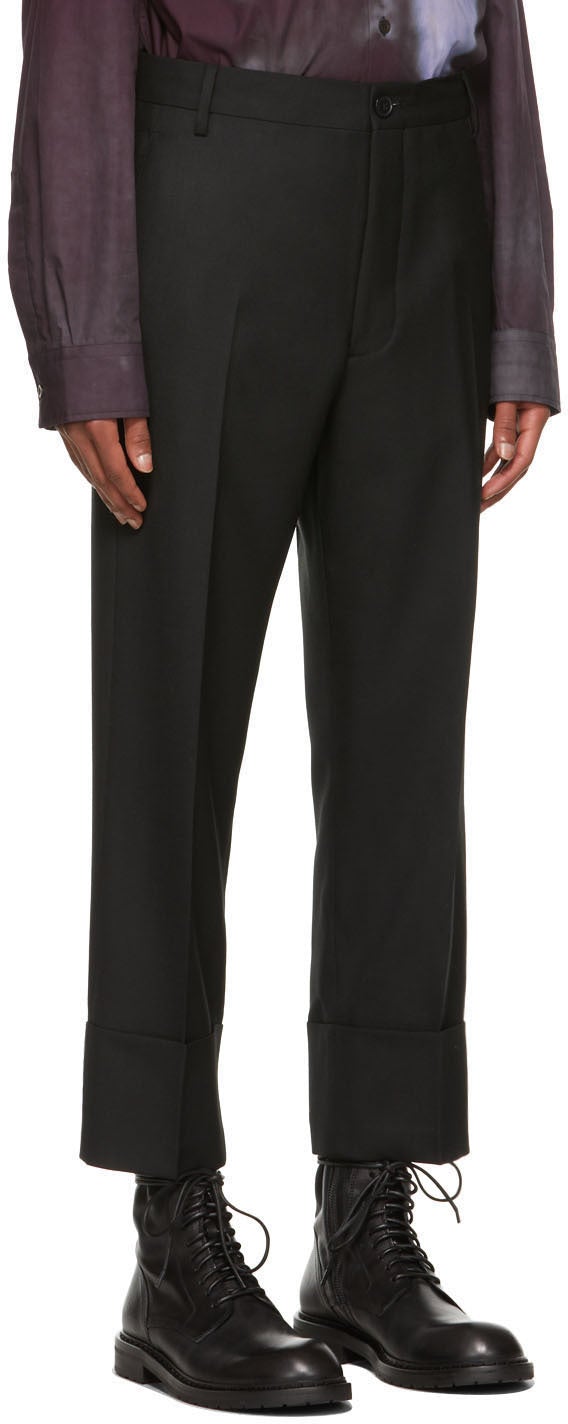 Straight-leg virgin wool twill trousers in black. Mid-rise. Cropped leg. Three-pocket styling. Belt loops at waistband. Central crease at legs. Rolled cuffs. Button-fly. Supplier color: Black 100% virgin wool. Brand: Vivienne Westwood