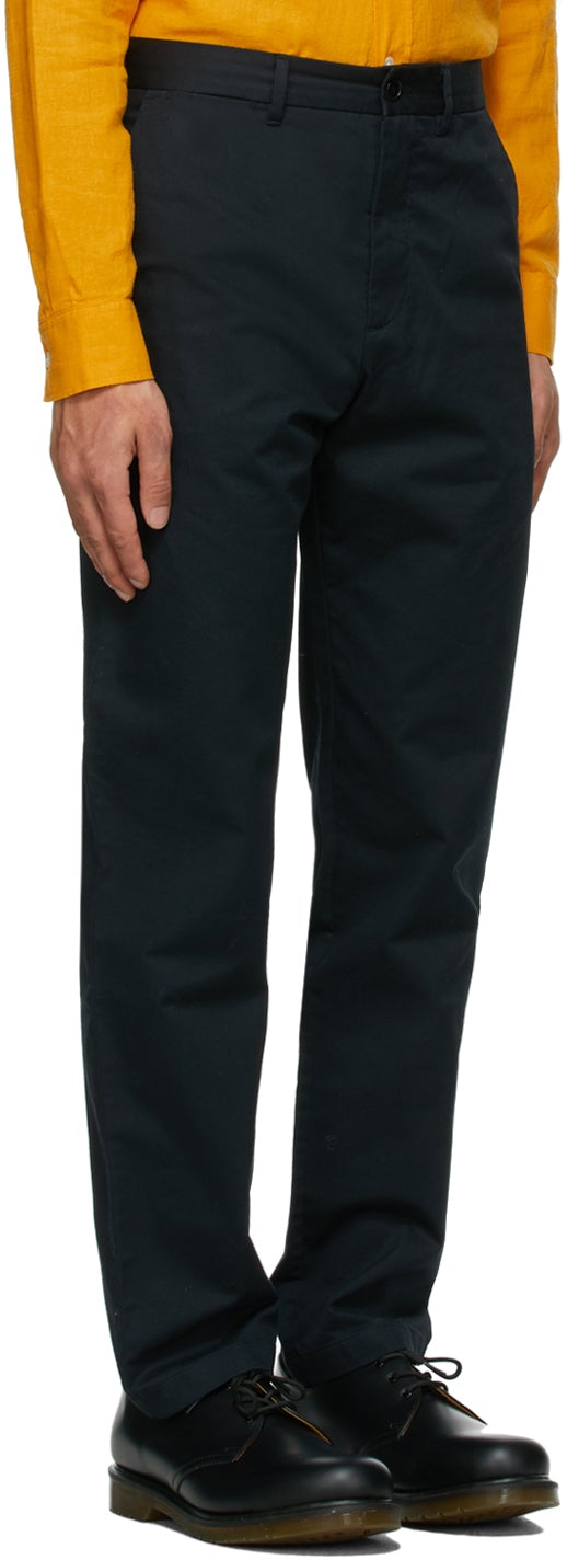 Slim-fit stretch cotton twill trousers in black. Mid-rise. Four-pocket styling. Belt loops at waistband. Textile logo flag in white at back waistband. Zip-fly. Tonal and silver-tone hardware. Supplier color: Black Body: 98% cotton, 2% elastane. Trim: 100% cotton. Brand: Wood Wood