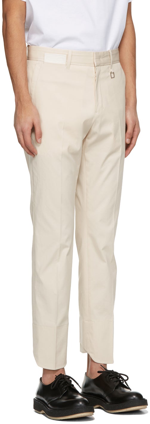 Slim-fit cotton-blend twill trousers in beige. Mid-rise. Four-pocket styling. Belt loops and logo hardware at waistband. Central creases at front and back. Cut-out at back cuffs. Zip-fly. Tonal and silver-tone hardware. Supplier color: Beige 67% cotton, 29% polyester, 4% elastane. Brand: Wooyoungmi