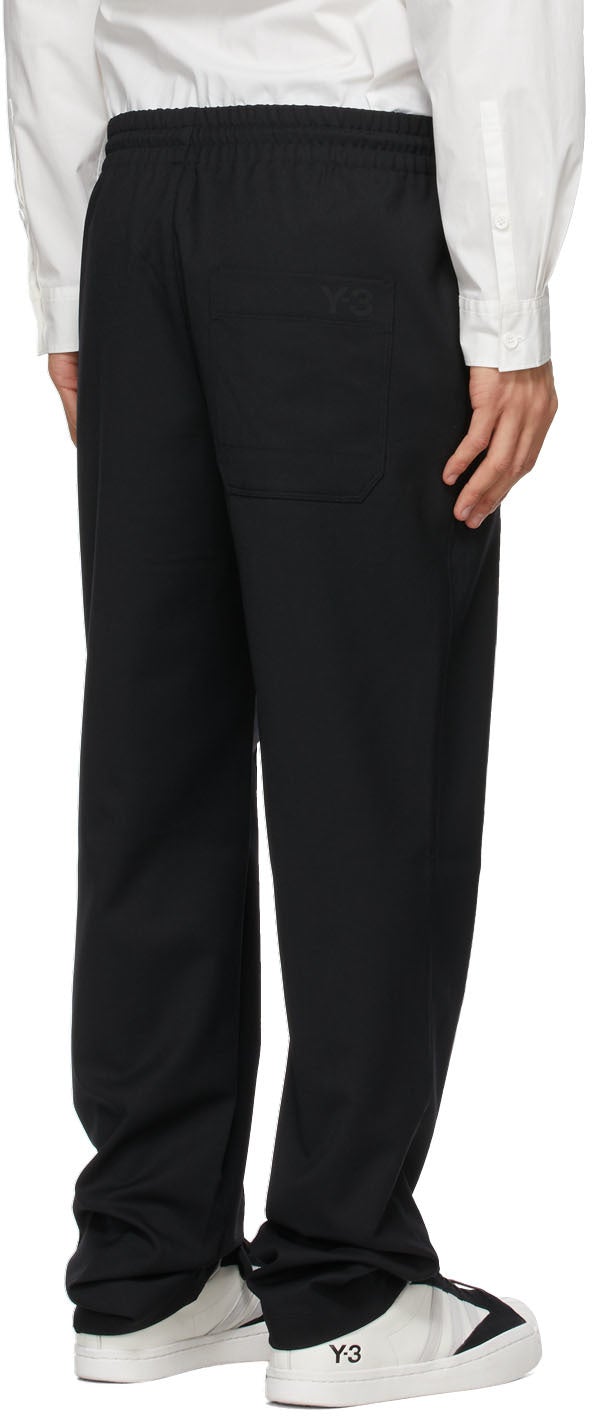 Relaxed-fit stretch wool-blend twill trousers in black. Mid-rise. Three-pocket styling. Drawstring at waistband. Central pinched seams at front. Tonal bonded logo at back pocket. Zip-fly. Tonal and silver-tone hardware. Supplier color: Black 57% wool, 38% polyester, 5% elastane. Brand: Y-3