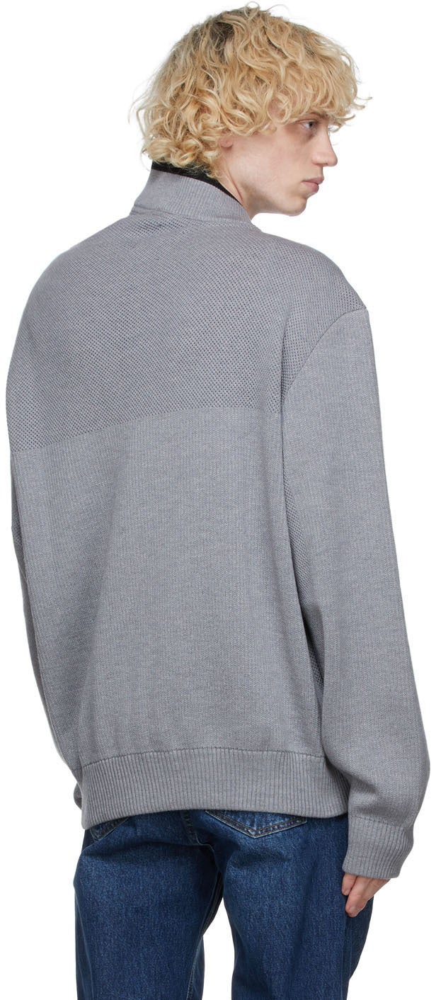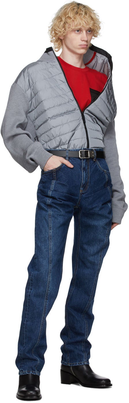 Long sleeve knit merino wool and down-filled quilted nylon jacket in grey. Rib knit asymmetric stand collar, cuffs, and hem. Two-way zip closure at front. Zippered pockets at waist. Logo appliqués at sleeve in black, red, and white. Black hardware. Part of the Y/Project x Canada Goose collaboration. Supplier color: Grey Fill: 80% goose down, 20% feathers. Body 1: 100% merino wool. Body 2: 100% nylon. Lining: 100% nylon. Brand: Y/Project
