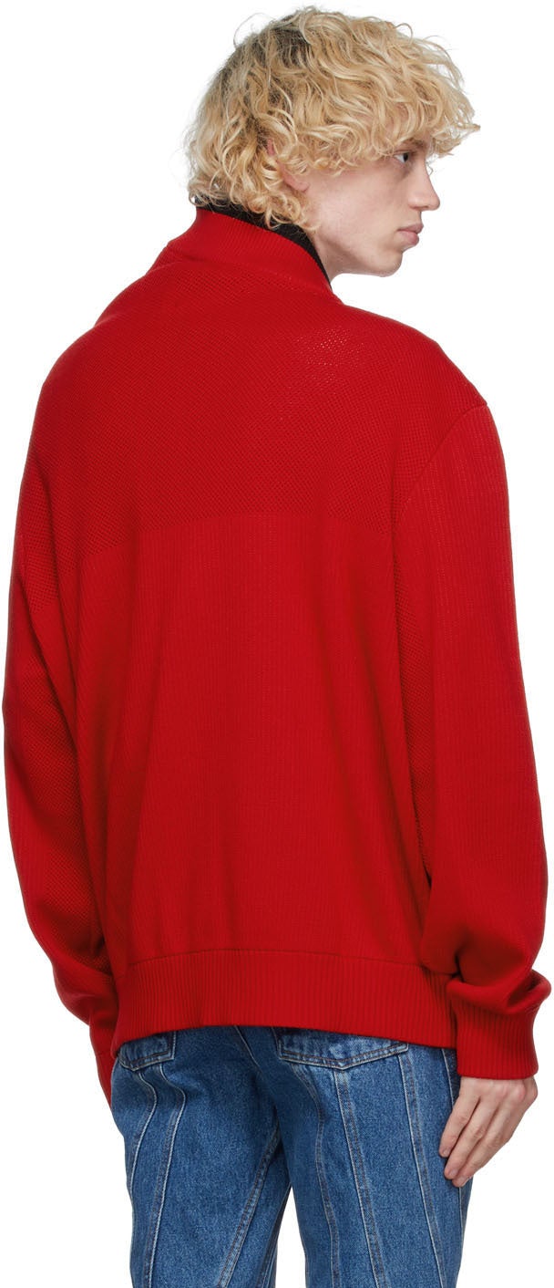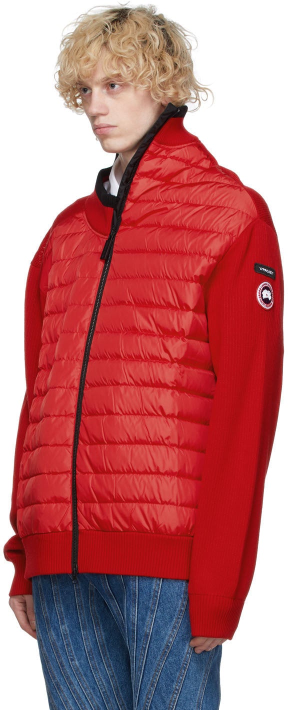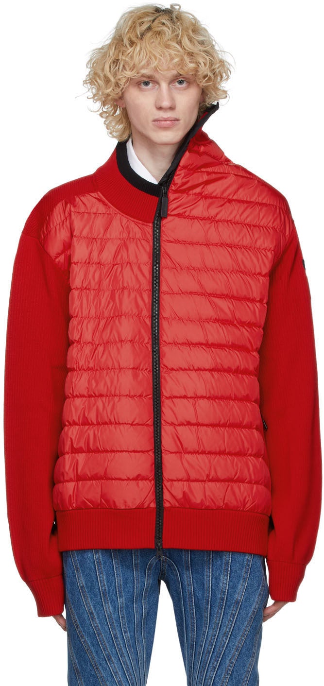 Long sleeve knit merino wool and down-filled quilted nylon jacket in red. Rib knit asymmetric stand collar, cuffs, and hem. Two-way zip closure at front. Zippered pockets at waist. Logo appliqués at sleeve in black, red, and white. Black hardware. Part of the Y/Project x Canada Goose collaboration. Supplier color: Red Fill: 80% goose down, 20% feathers. Body 1: 100% merino wool. Body 2: 100% nylon. Lining: 100% nylon. Brand: Y/Project
