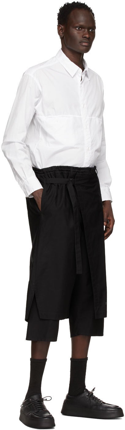 Wide-leg cotton twill trousers in black. Layered construction. Mid-rise. Cropped leg. Dropped inseam. Four-pocket styling. Belt loops at elasticized waistband. Skirt-style overlay featuring belt with cinch-fastening at front. Zip-fly. Tonal hardware. Supplier color: Black 100% cotton. Brand: Yohji Yamamoto