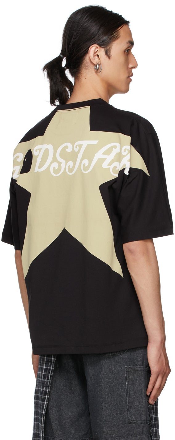 Short sleeve cotton jersey T-shirt in black. Rib knit crewneck. Graphic printed in white and beige at front and back. Supplier color: Black 100% cotton. Brand: Youths in Balaclava