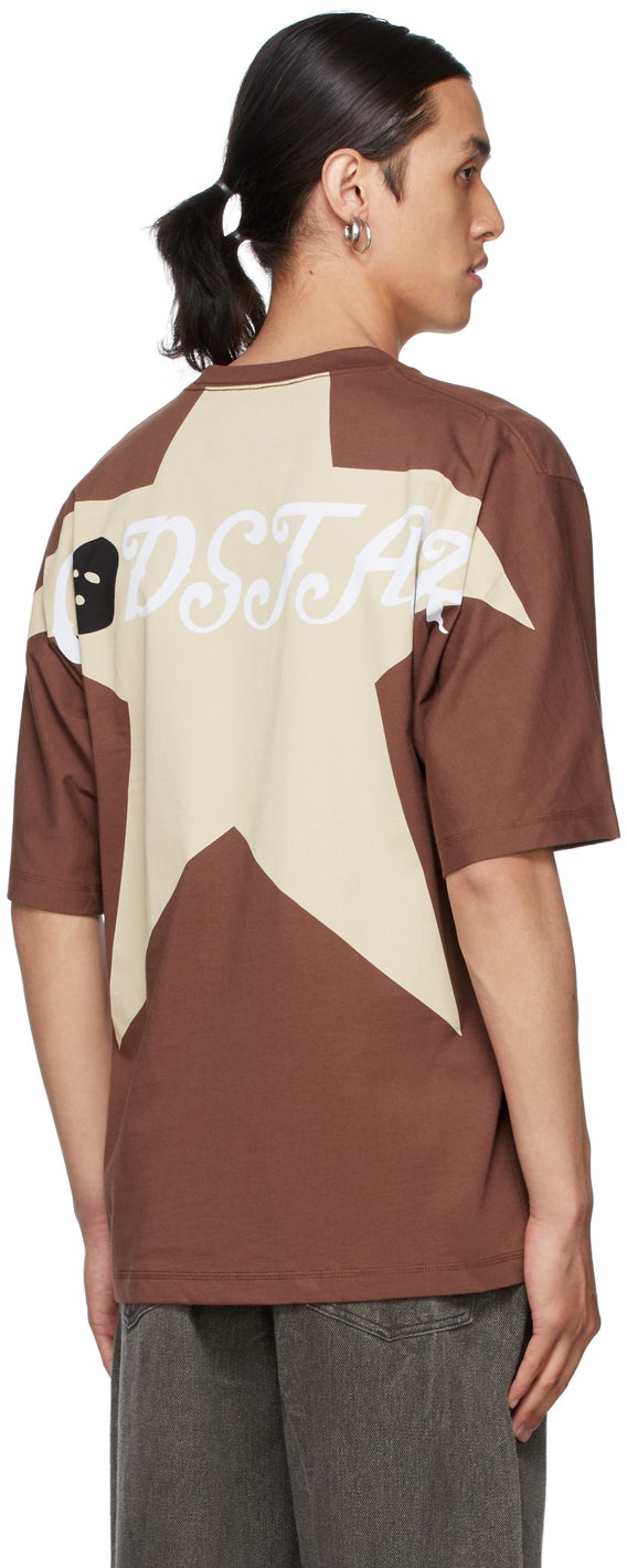 Short sleeve cotton jersey T-shirt in red. Rib knit crewneck. Graphic printed in white, black, and beige at front and back. Supplier color: Burgundy 100% cotton. Brand: Youths in Balaclava
