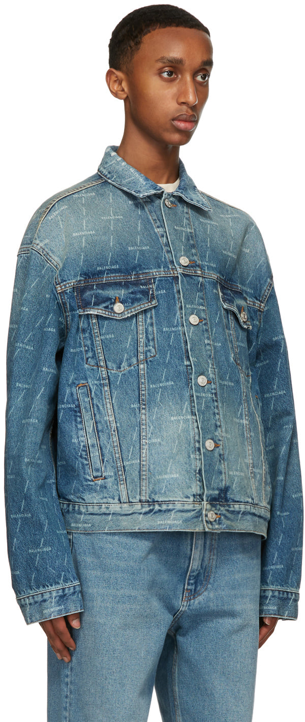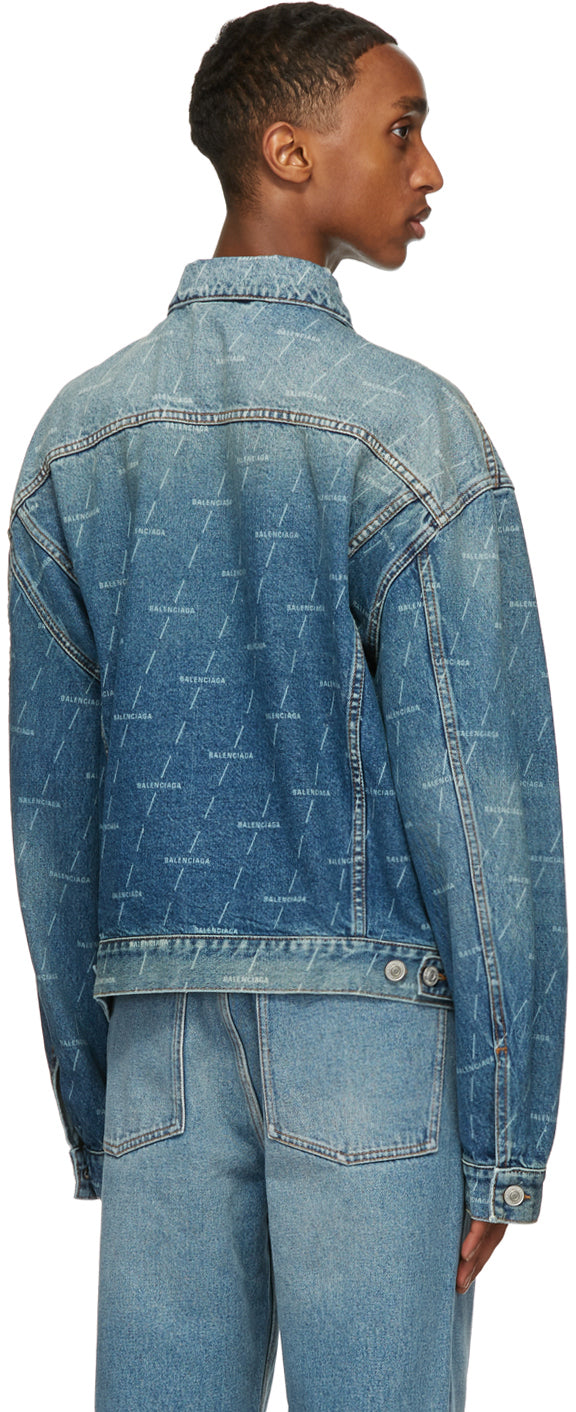 Long sleeve non-stretch denim jacket in blue. Logo pattern etched throughout. Spread collar. Button closure at front. Flap pockets at chest. Welt pockets at waist. Dropped shoulders. Single-button barrel cuffs. Adjustable buttoned tabs at back hem. Unlined. Silver-tone logo-engraved hardware. Supplier color: Authentic dark blue 100% cotton. Brand: Balenciaga