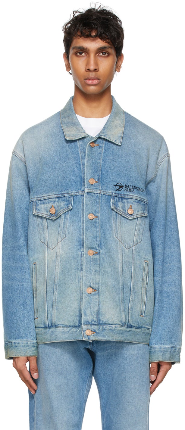 Long sleeve non-stretch denim jacket in blue. Fading throughout. Spread collar. Button closure at front. Logo embroidered in black at chest and back. Flap pockets at chest. Welt pockets at waist. Single-button barrel cuffs. Adjustable buttoned tabs at back hem. Unlined. Logo-engraved bronze-tone hardware. Contrast stitching in tan. Supplier color: Blue Body: 100% cotton. Trim 1: 100% polyester. Trim 2: 65% polyester, 35% cotton. Brand: Balenciaga