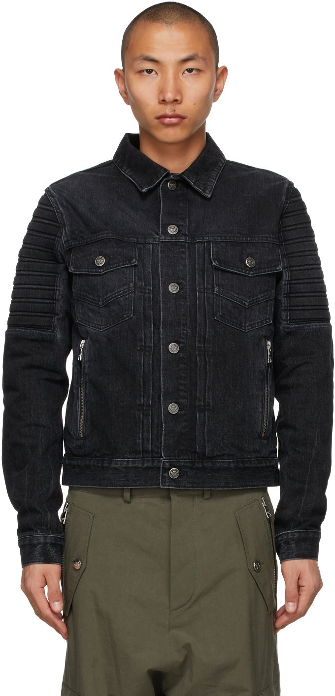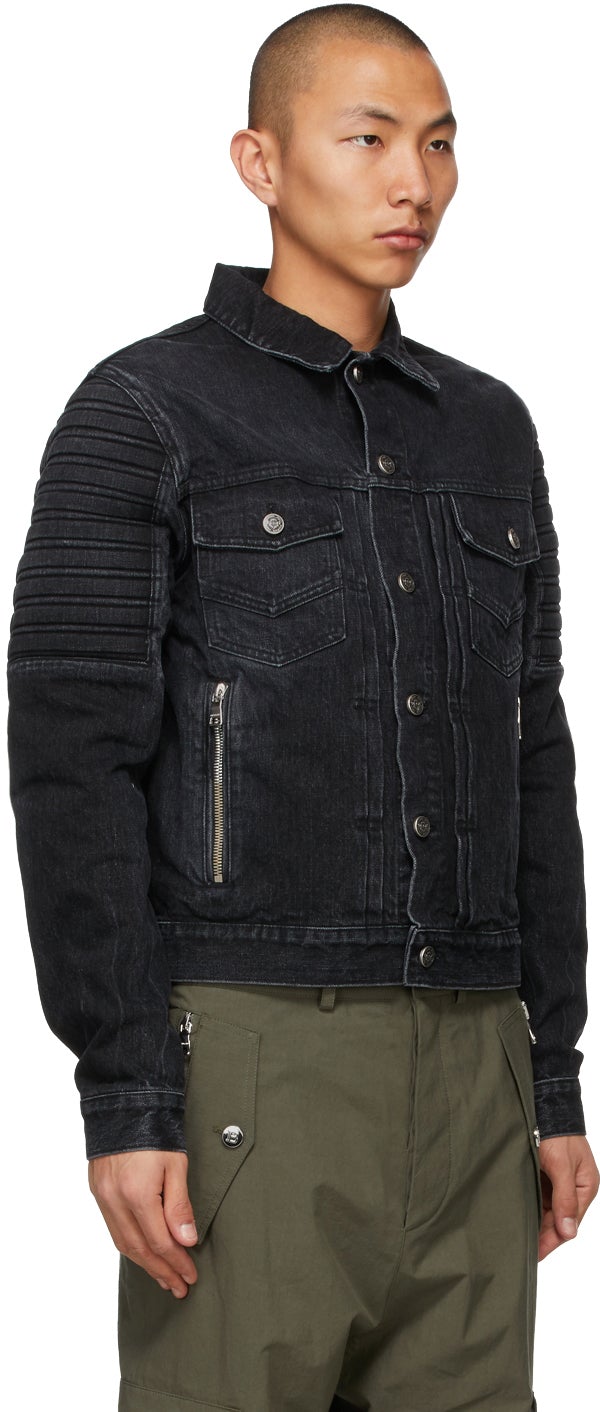 Long sleeve paneled non-stretch denim jacket in black. Fading throughout. Spread collar. Button closure at front. Flap pockets at chest. Zippered pockets at waist. Quilted panel at sleeves. Single-button barrel cuffs. Logo embossed at back. Adjustable buttoned tabs at back waistband. Patch pockets at interior. Partial tonal cotton twill lining. Logo-engraved antiqued silver-tone hardware. Supplier color: Black Body: 100% cotton. Trim: 100% cotton. Lining: 100% cotton. Brand: Balmain