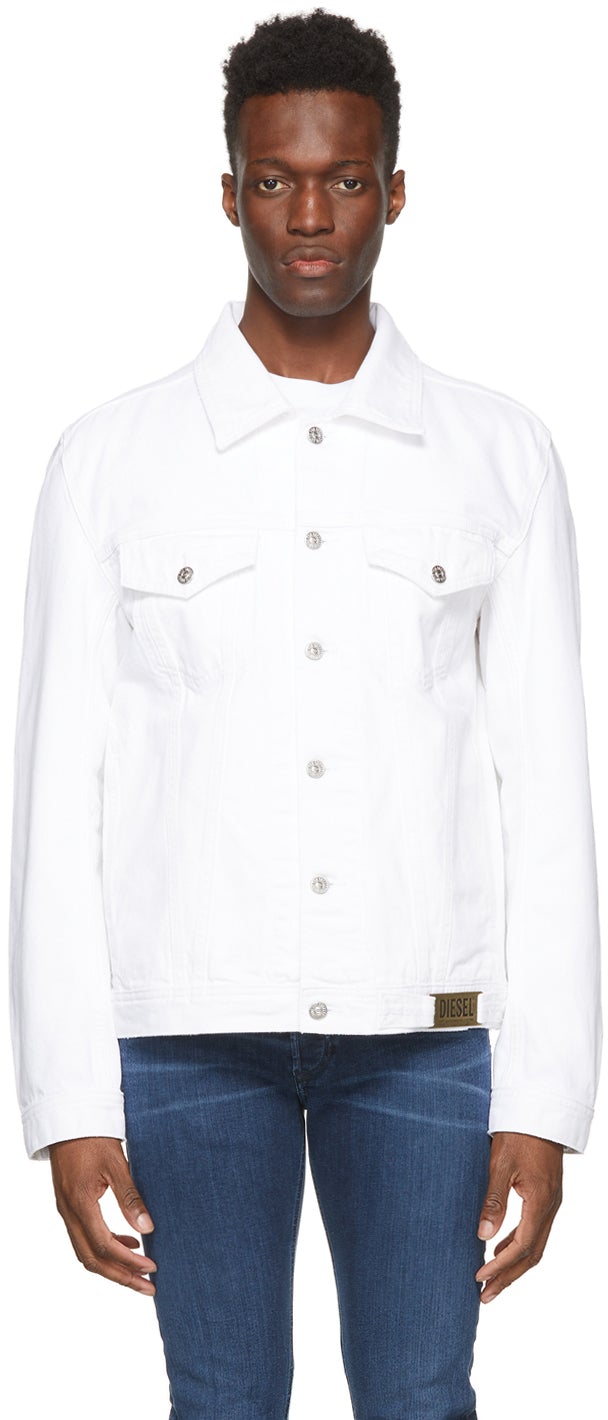 Long sleeve non-stretch denim jacket in white. Spread collar. Button closure at front. Flap pockets at chest. Seam pockets at waist. Logo plaque at front hem. Tonal embroidered text at sleeve. Single-button barrel cuffs. Adjustable buttoned tabs at back hem. Patch pockets at interior. Silver-tone and antiqued gold hardware. Supplier color: White 100% cotton. Brand: Diesel