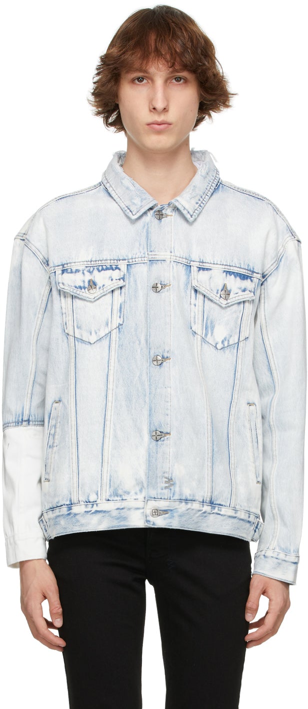 Long sleeve non-stretch denim jacket in blue. Fading, distressing, and bleached effect throughout. Spread collar. Button closure at front. Flap pockets at chest. Welt pockets at waist. Panel in white at cuff. Single-button barrel cuffs. Graphic and text printed in grey at back. Signature embroidered graphic in red, logo printed in red, and adjustable buttoned tabs at back hem. Gunmetal-tone hardware. Supplier color: Mayhem 100% cotton. Brand: Ksubi