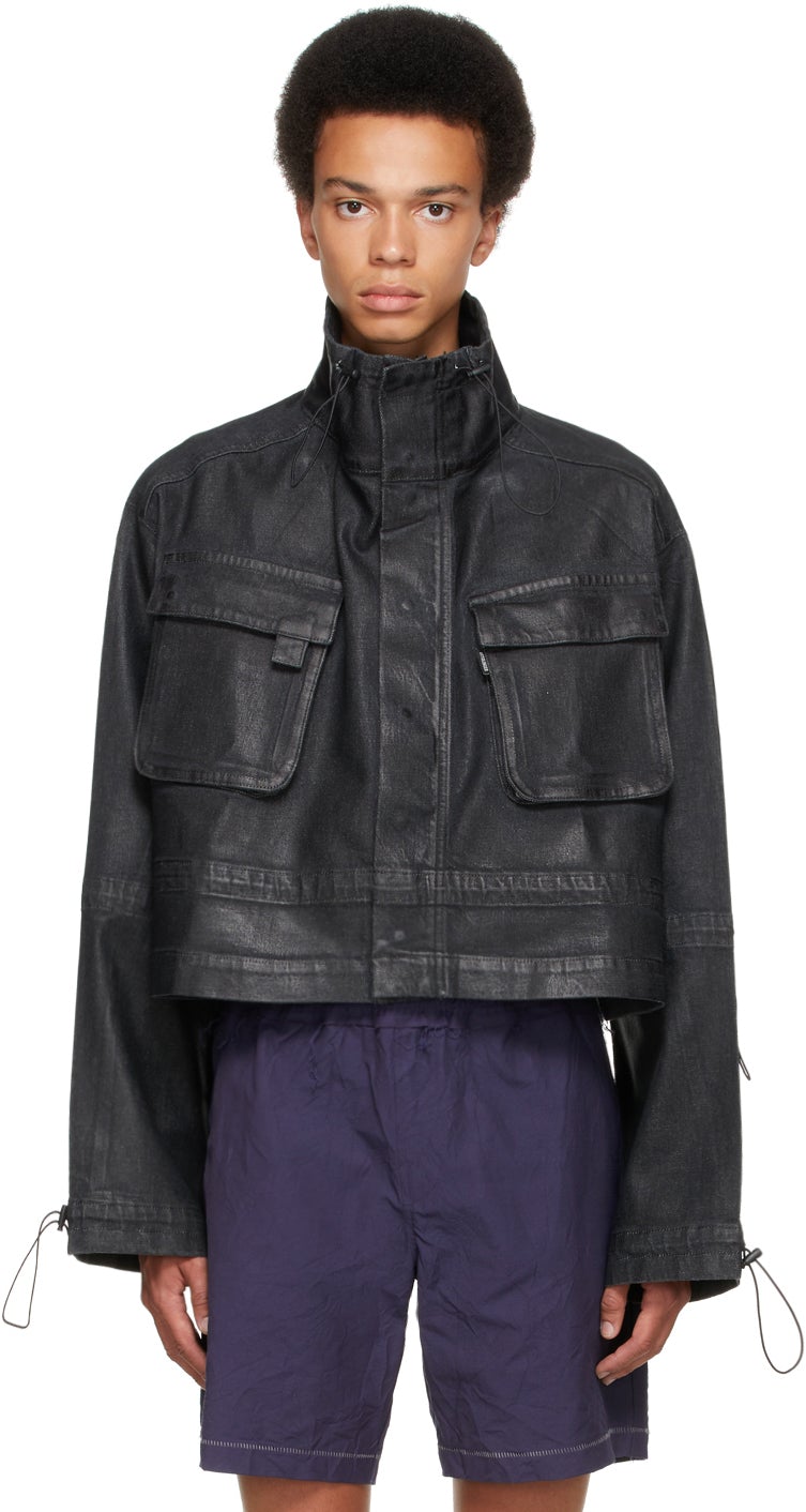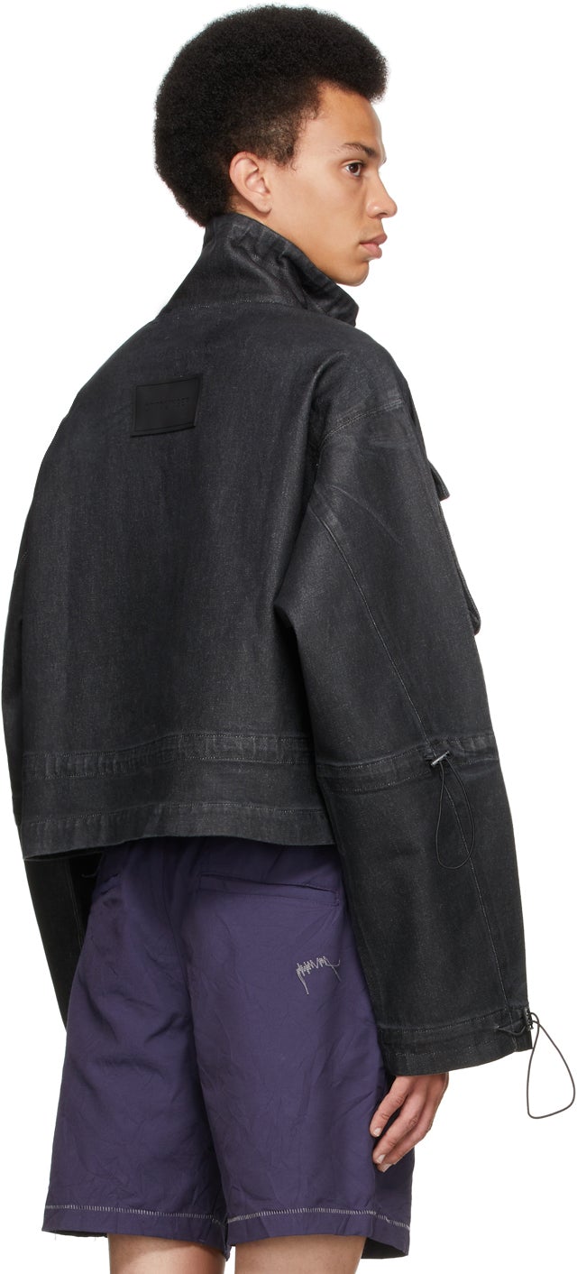 Long sleeve stretch denim jacket in black. Bungee-style drawstring at stand collar. Concealed zip closure at front with press-stud placket. Flap pockets at chest featuring tonal textile logo flag. Bungee-style drawstring at sleeves, cuffs, and waist. Tonal rubberized logo patch at back. Tonal hardware. Supplier color: Black 77% cotto, 20% reused cotton, 2% recycled polyester, 1% elastane. Brand: Ottolinger