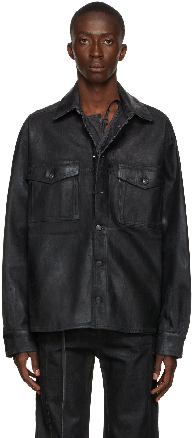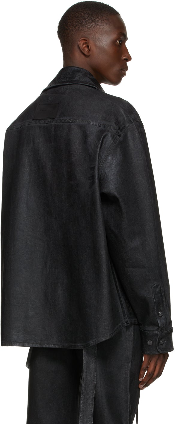 Long sleeve coated stretch recycled cotton-blend denim jacket in black. Spread collar. Button closure featuring concealed drawstring and four-button placket at front. Flap pockets at chest. Welt pockets at waist. Adjustable two-button barrel cuffs. Tonal rubberized logo patch at back collar. Shirttail hem. Tonal hardware. Supplier color: Ink black 77% cotton, 20% recycled cotton, 2% recycled polyester, 1% elastane. Brand: Ottolinger
