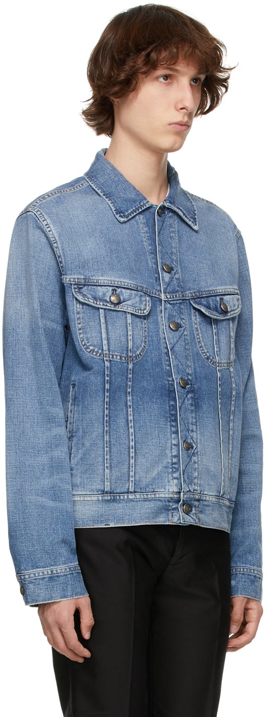 Long sleeve non-stretch denim jacket in blue. Fading and subtle distressing throughout. Spread collar. Button closure at front. Flap pockets at chest. Welt pockets at waist. Single-button barrel cuffs. Adjustable buttoned tabs and leather logo patch in brown at back hem. Antiqued logo-embossed silver-tone hardware. Contrast stitching in tan. Supplier color: Baia blue 100% cotton. Brand: Ralph Lauren Purple Label