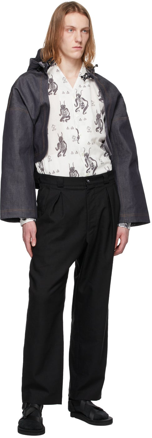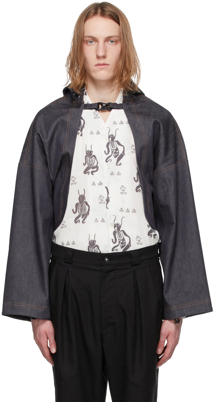 Long sleeve water-resistant non-stretch cotton and nylon-blend denim jacket in indigo. Bungee-style drawstring at hood, cuffs, and cropped hem. Press-release fastening at throat. Open front. Drop-tail hem. Bonded seam construction at interior. Full bonded jersey lining. Black hardware. Contrast stitching in tan. Supplier color: Indigo 70% cotton, 30% nylon. Brand: Sasquatchfabrix.