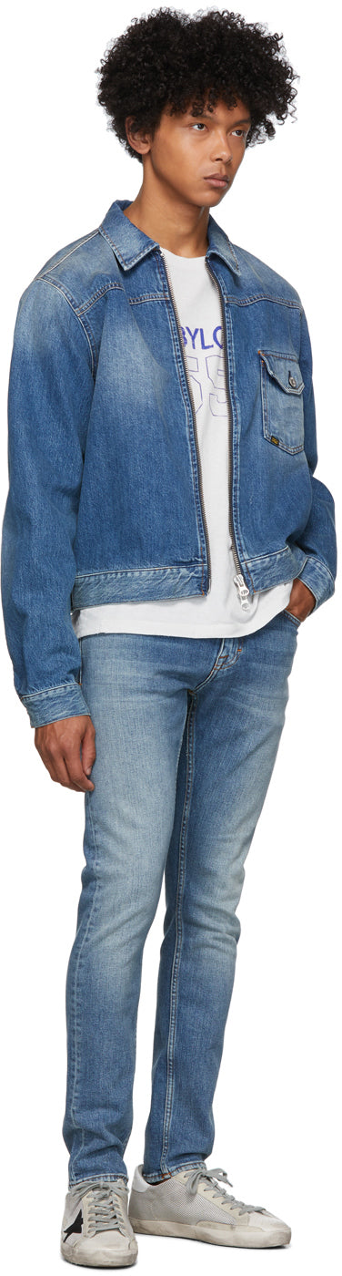 Long sleeve 13 oz. Italian non-stretch denim jacket in blue. Fading throughout. Spread collar. Zip closure at front. Buttoned flap pocket featuring textile patch in navy and yellow at chest. Adjustable button tabs at back hem. Single-button barrel cuffs. Silver-tone hardware. Contrast stitching in tan. Supplier color: Ray 100% cotton. Brand: Tiger of Sweden Jeans