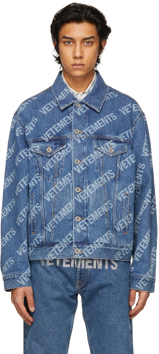 Long sleeve non-stretch denim jacket in blue. Faded logo pattern in off-white throughout. Spread collar. Button closure at front. Flap pockets at chest. Welt pockets at waist. Single-button barrel cuffs. Adjustable buttoned tabs at back waist. Patch pockets at interior. Unlined. Logo-engraved silver-tone hardware. Contrast stitching in tan. Supplier color: Blue 100% cotton. Brand: VETEMENTS