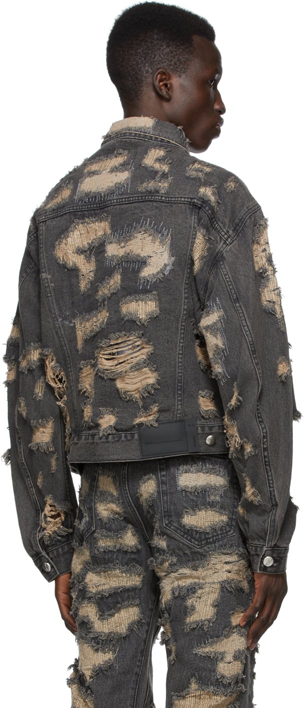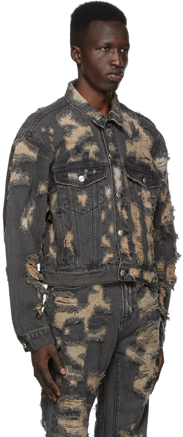 Long sleeve non-stretch faded denim jacket in black. Signature distressing with tonal topstitching throughout. Spread collar. Button closure at front. Flap pockets at chest. Welt pockets at waist. Single-button barrel cuffs. Adjustable buttoned tabs and tonal rubberized logo patch at back hem. Unlined. Logo-engraved antiqued silver-tone hardware. Supplier color: Black 100% cotton. Brand: We11done