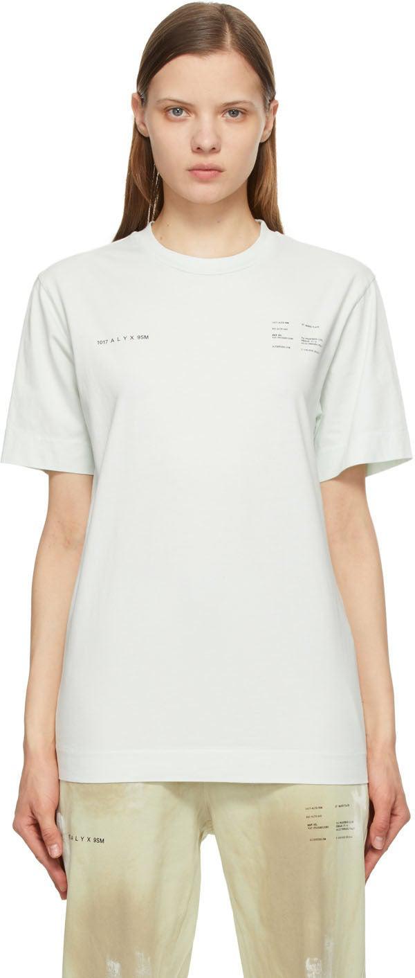 Short sleeve cotton jersey T-shirt in green. Rib knit crewneck collar. Logo and text printed in black at chest. Supplier color: Light ghost 100% cotton. Brand: 1017 ALYX 9SM