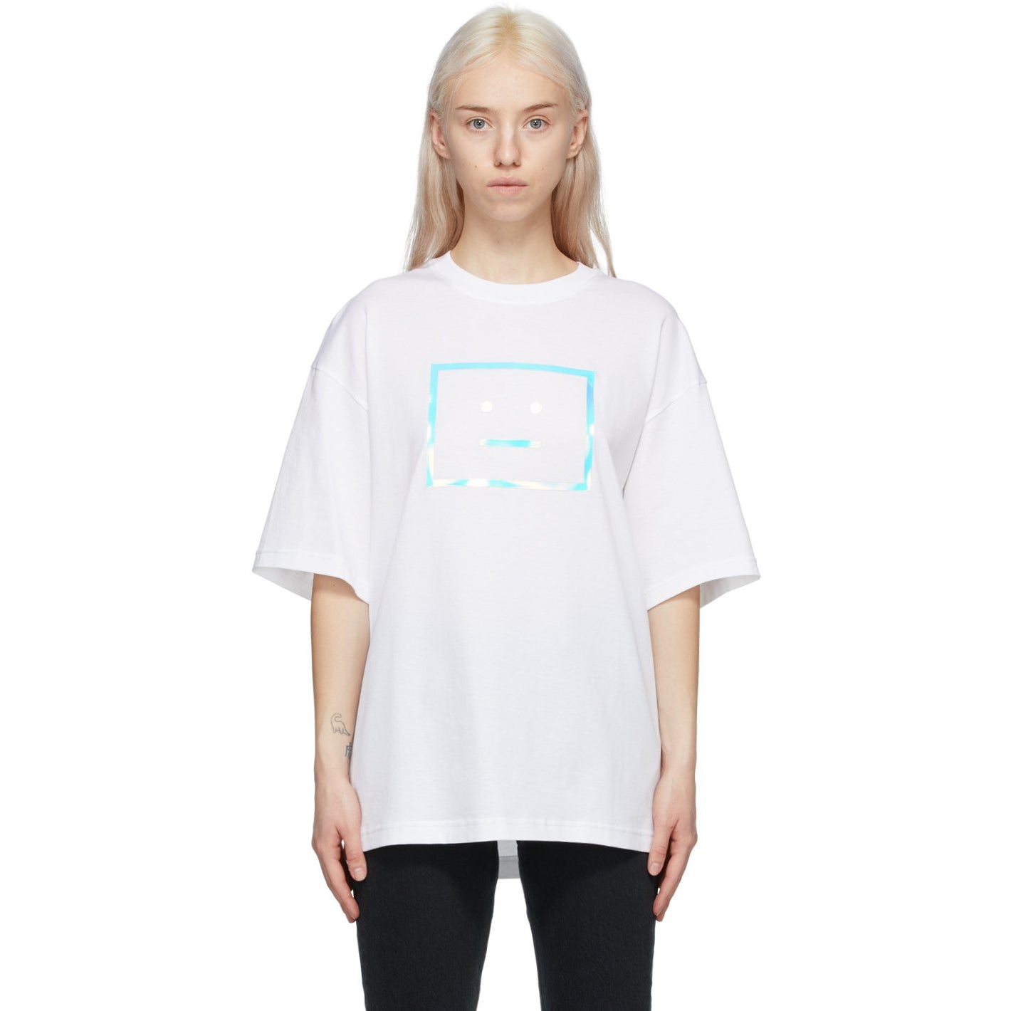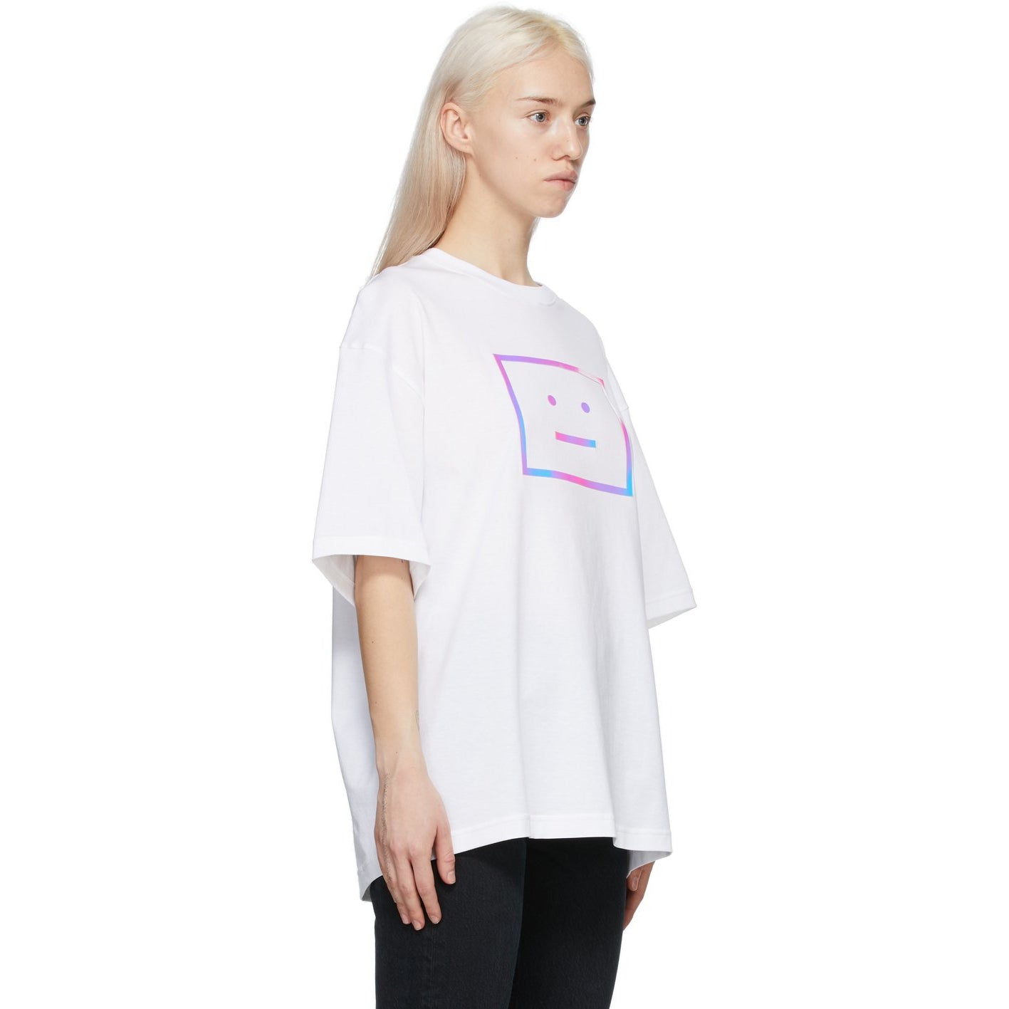 Short sleeve organic cotton jersey T-shirt in white. Rib knit crewneck collar. Logo bonded in reflective silver-tone at chest. Supplier color: Optic white 100% organic cotton. Brand: Acne Studios