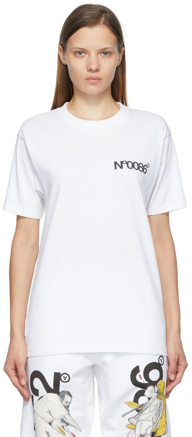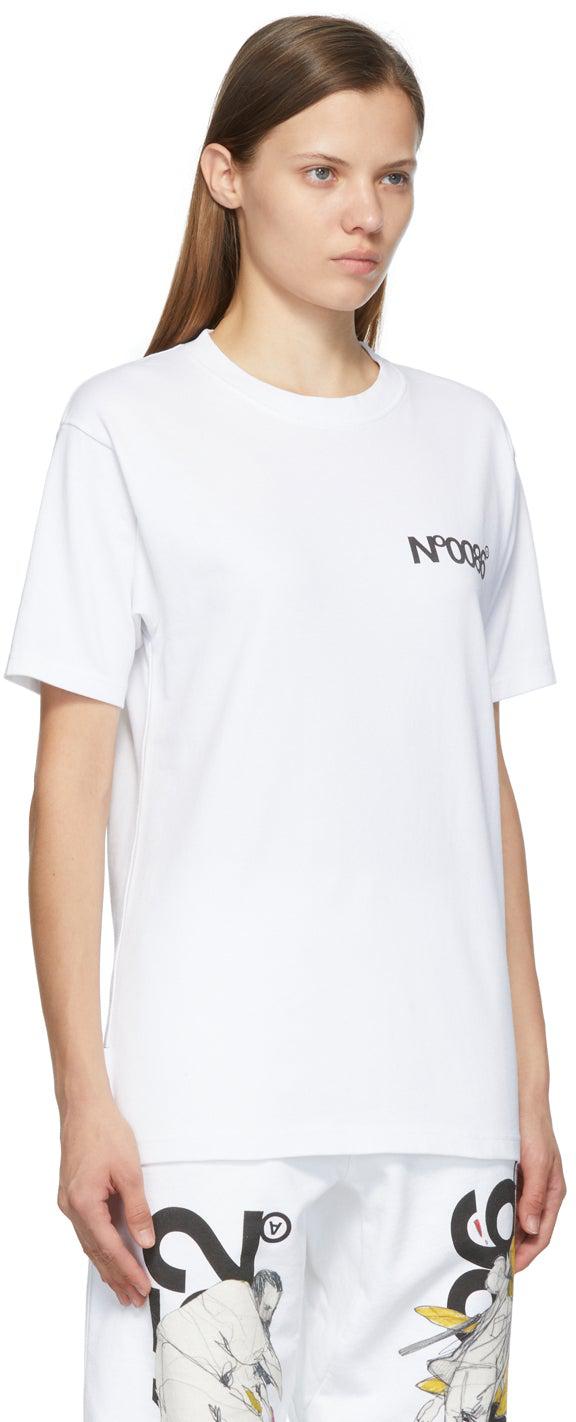 Short sleeve organic cotton jersey T-shirt in white. Rib knit crewneck collar. Logo printed in black at chest. Textile logo flag at side-seam. Logo graphic printed in black and yellow at back. Supplier color: White 100% organic cotton. Brand: Aitor Throup’s TheDSA
