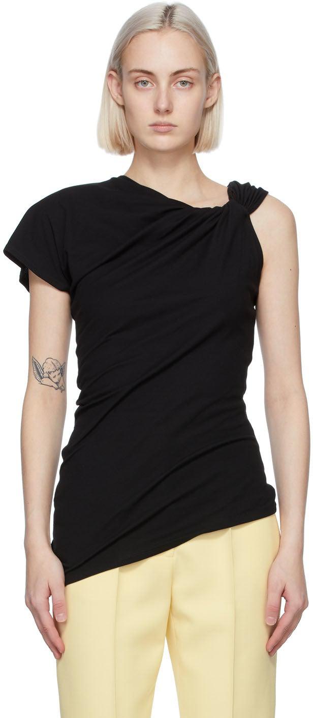 Short sleeve cotton jersey T-shirt in black. Modified crewneck collar. Knotted accent and gathering at shoulder. Supplier color: Black 100% cotton. Brand: Alexander McQueen