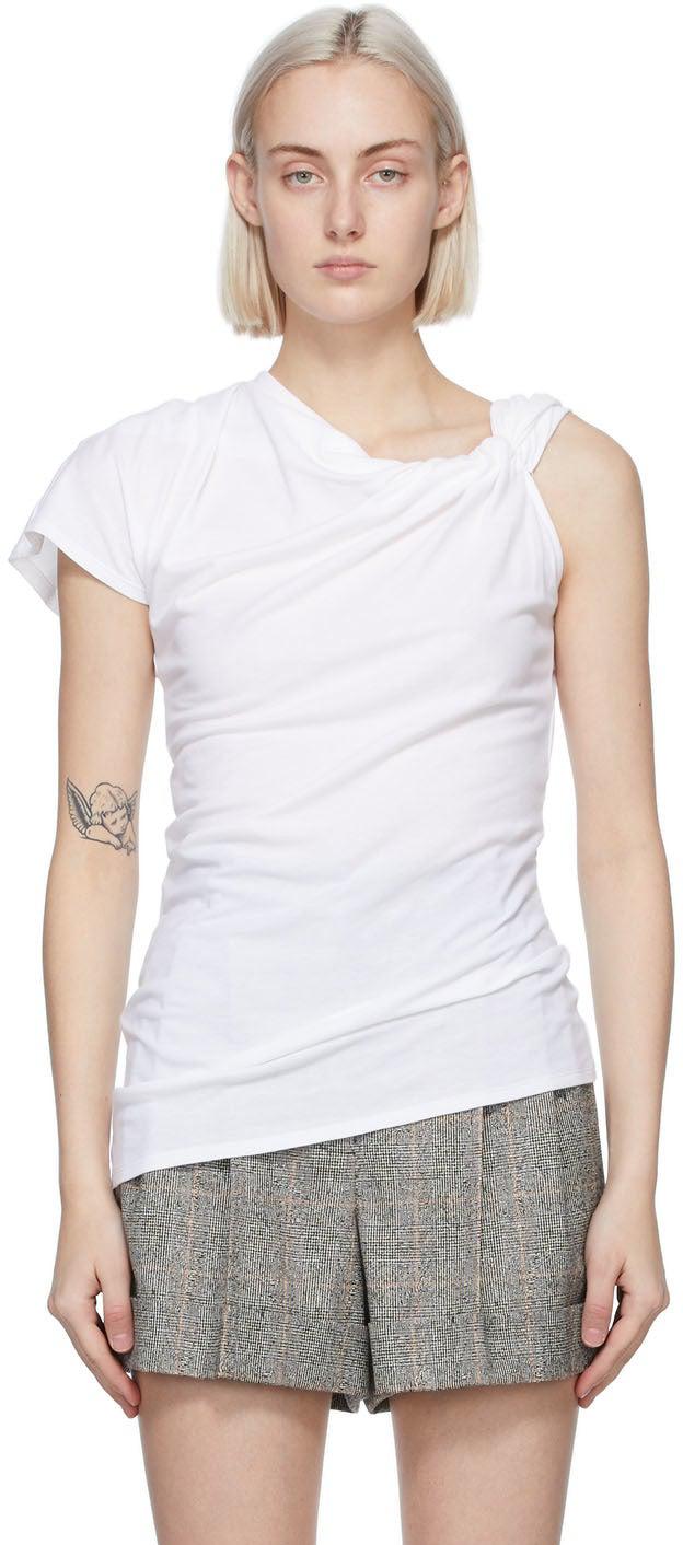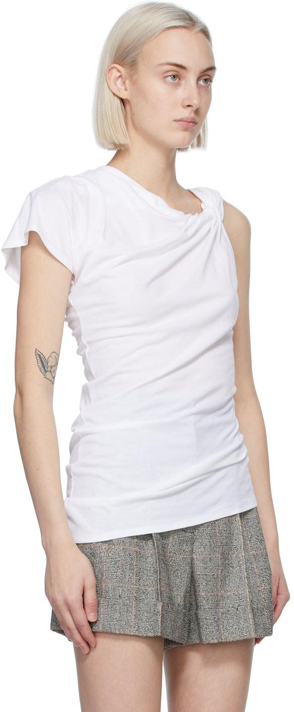 Short sleeve cotton jersey T-shirt in white. Modified crewneck collar. Knotted accent and gathering at shoulder. Supplier color: White 100% cotton. Brand: Alexander McQueen