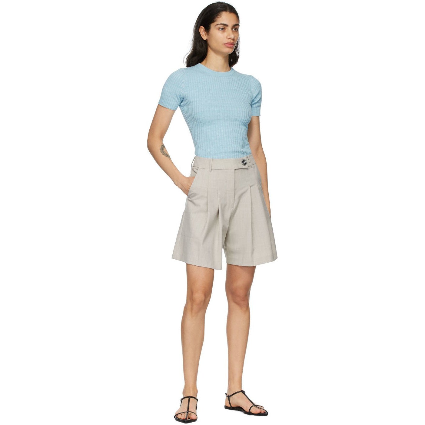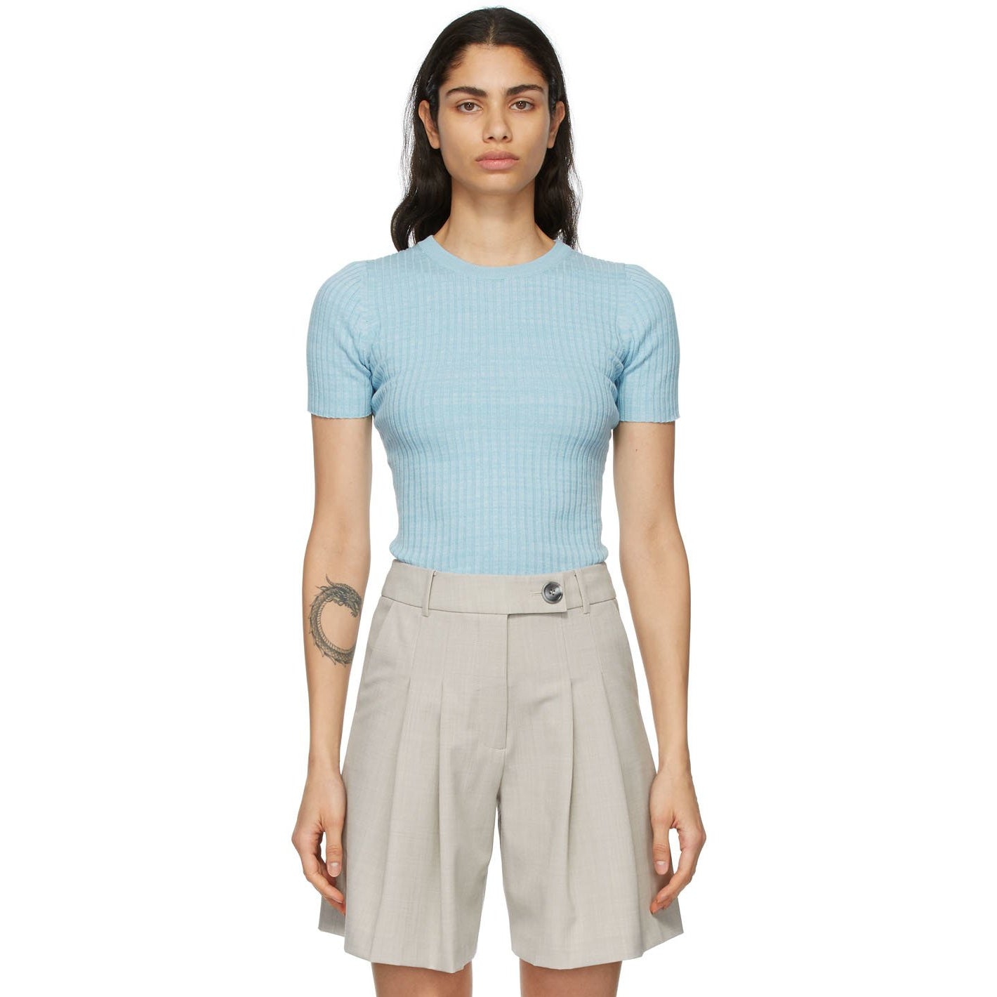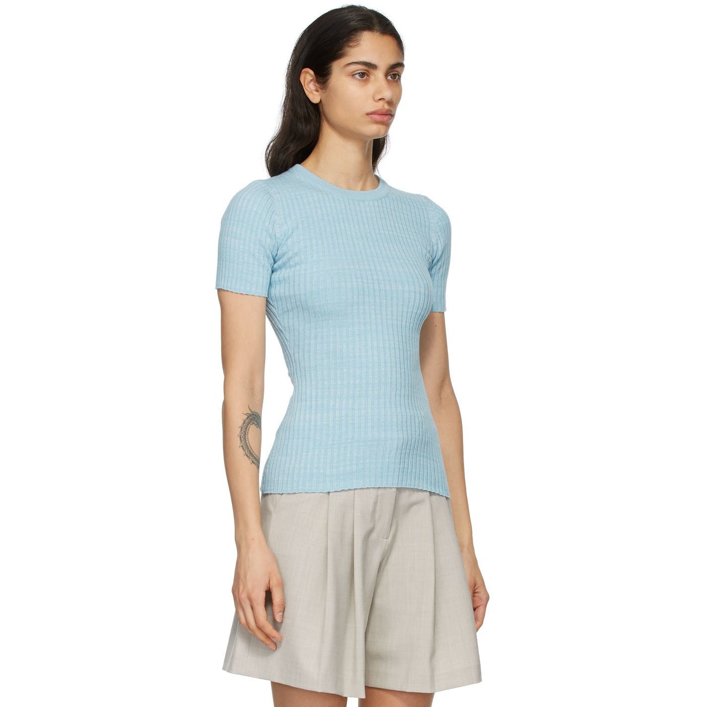 Short sleeve rib knit cotton T-shirt in blue. Crewneck collar. Raw edge at cuffs and hem. Supplier color: Capri 100% cotton. Brand: Anna Quan
