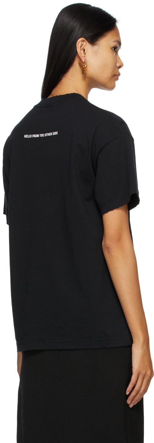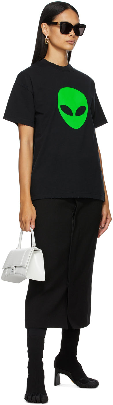 Short sleeve cotton jersey T-shirt in black. Distressing at rib knit crewneck collar, cuffs, and hem. Graphic printed in green at front. Text printed in white at back. Supplier color: Black/Acid green 100% cotton. Brand: Balenciaga