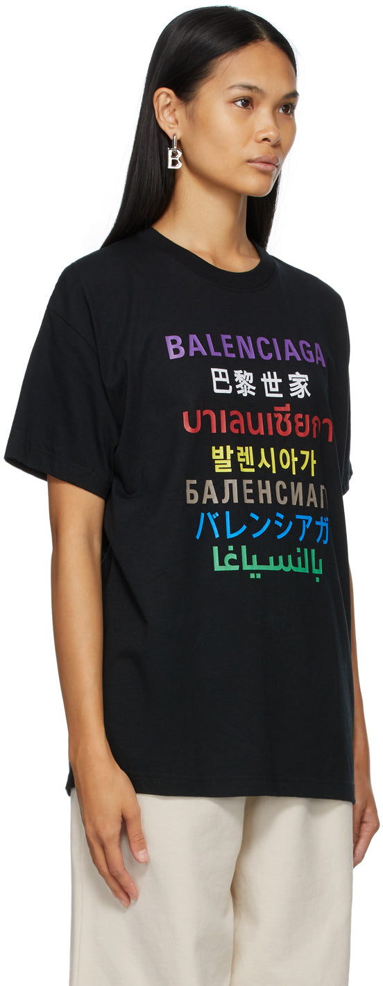 Short sleeve cotton-blend T-shirt in black. Rib knit crewneck collar. Text printed in multicolor at front. Supplier color: Black 65% polyester, 35% cotton. Brand: Balenciaga