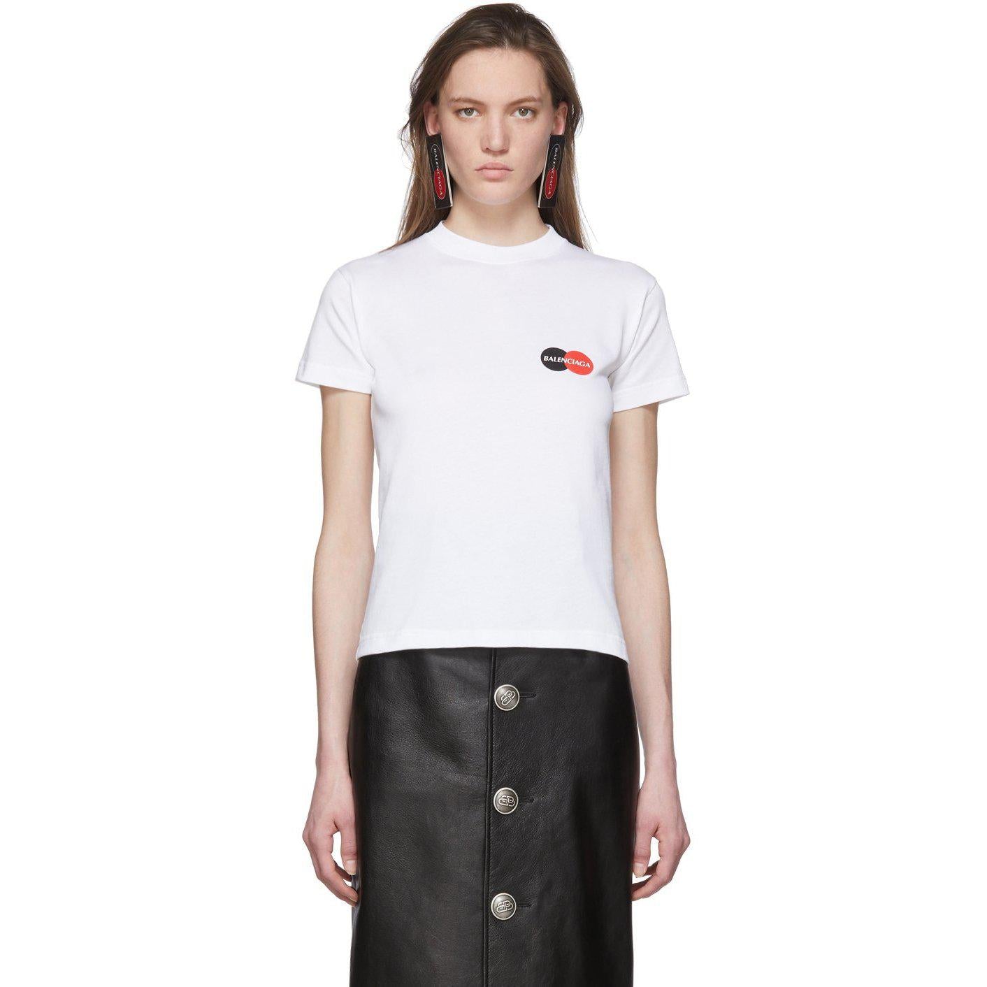 Short sleeve cotton jersey t-shirt in white. Rib knit crewneck collar. Logo graphic printed in white, black, and red at chest and back. Supplier color: White 100% cotton. Brand: Balenciaga