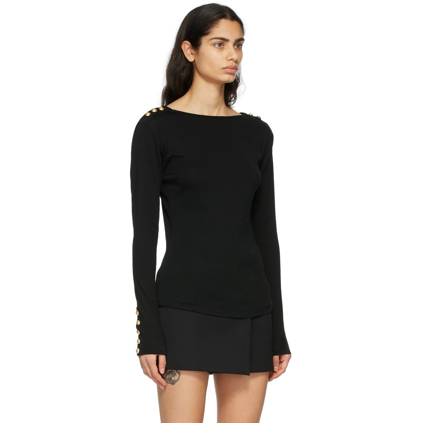 Long sleeve cotton jersey T-shirt in black. Rib knit crewneck collar. Button accents at shoulders and cuffs. Logo-engraved gold-tone hardware. Supplier color: Black 100% cotton. Brand: Balmain
