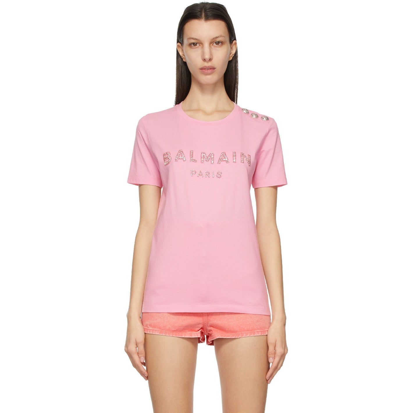 Short sleeve cotton jersey T-shirt in pink. Rib knit crewneck collar. Crystal-cut logo appliqués in white at front. Button detailing at shoulder. Logo-engraved silver-tone hardware. Supplier color: Rose Body: 100% cotton. Trim: 70% glass, 30% brass. Brand: Balmain