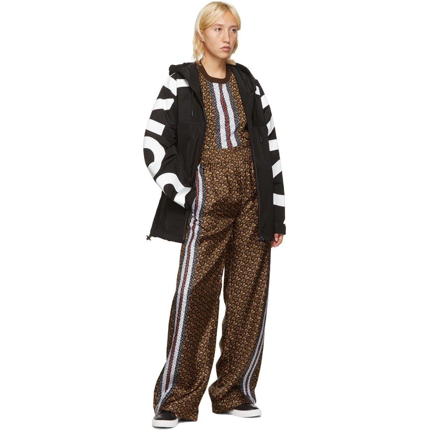Short sleeve stretch cotton jersey T-shirt in brown. Logo printed in brown and tan throughout. Rib knit crewneck collar. Stripe pattern in black, white, and red at front. Supplier color: Brown Body: 100% cotton. Trim: 97% cotton, 3% elastane. Brand: Burberry