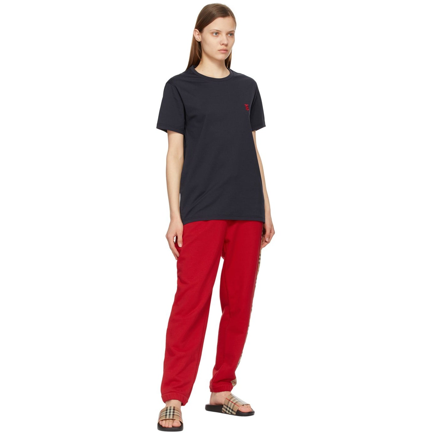 Short sleeve cotton jersey T-shirt in navy. Rib knit crewneck collar. Logo embroidered in red at chest. Supplier color: Navy Body: 100% cotton. Trim: 97% cotton, 3% elastane. Brand: Burberry