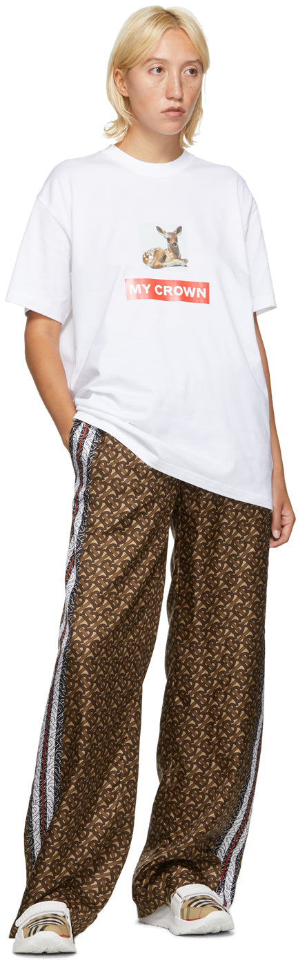 Short sleeve stretch cotton jersey T-shirt in white. Rib knit crewneck collar. Graphic and text printed at front. Logo printed in black at back. Supplier color: White 97% cotton, 3% elastane. Brand: Burberry