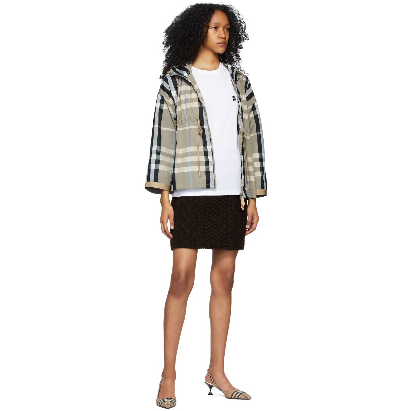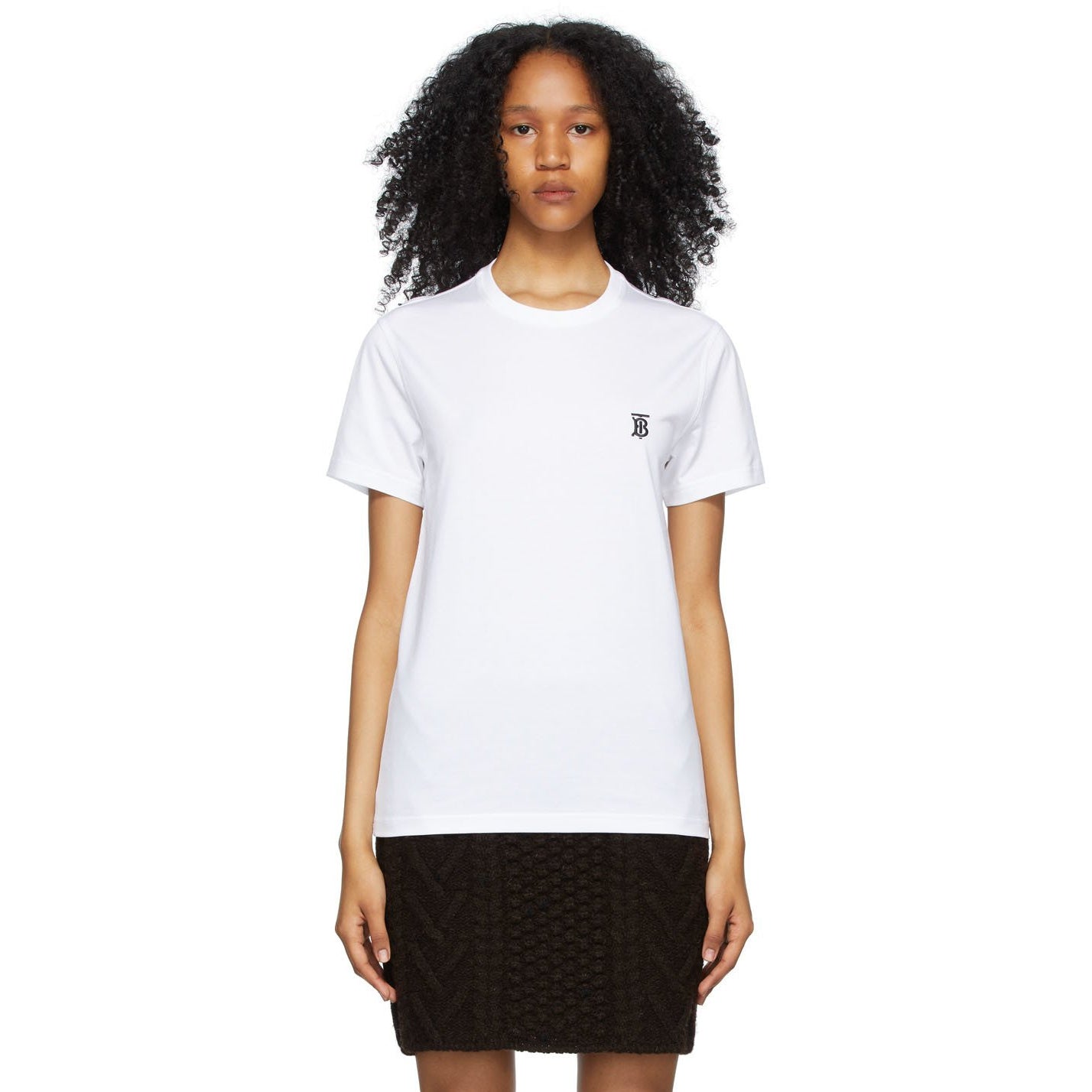 Short sleeve cotton jersey T-shirt in white. Rib knit crewneck collar. Logo embroidered in black at chest. Supplier color: White Body: 100% cotton. Trim: 97% cotton, 3% elastane. Brand: Burberry
