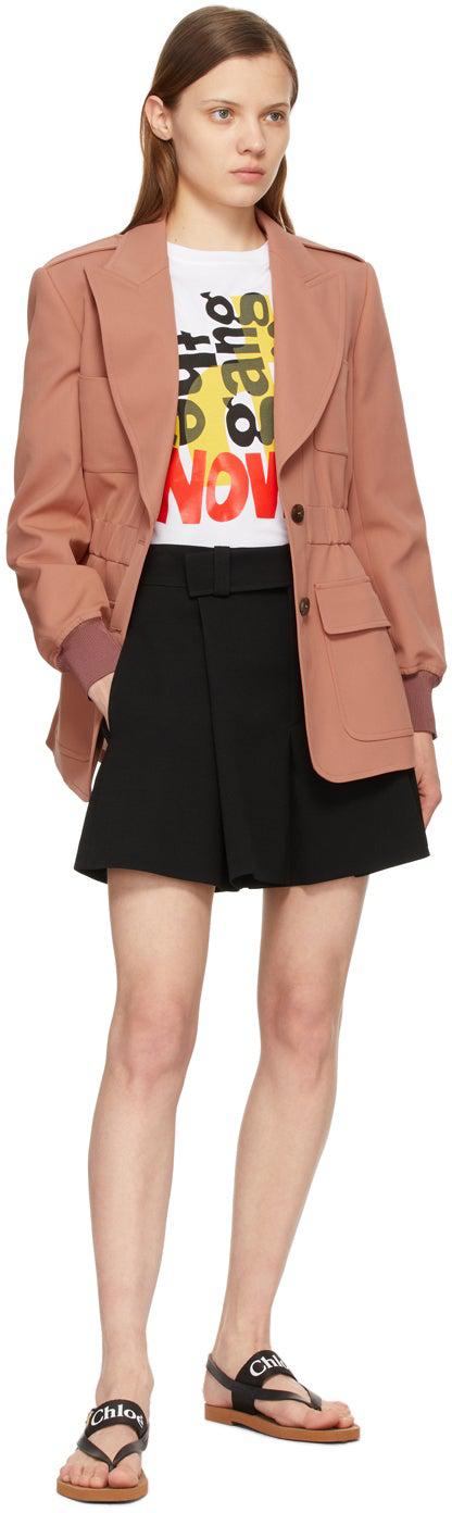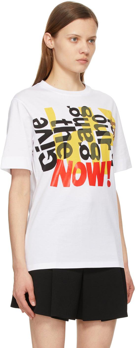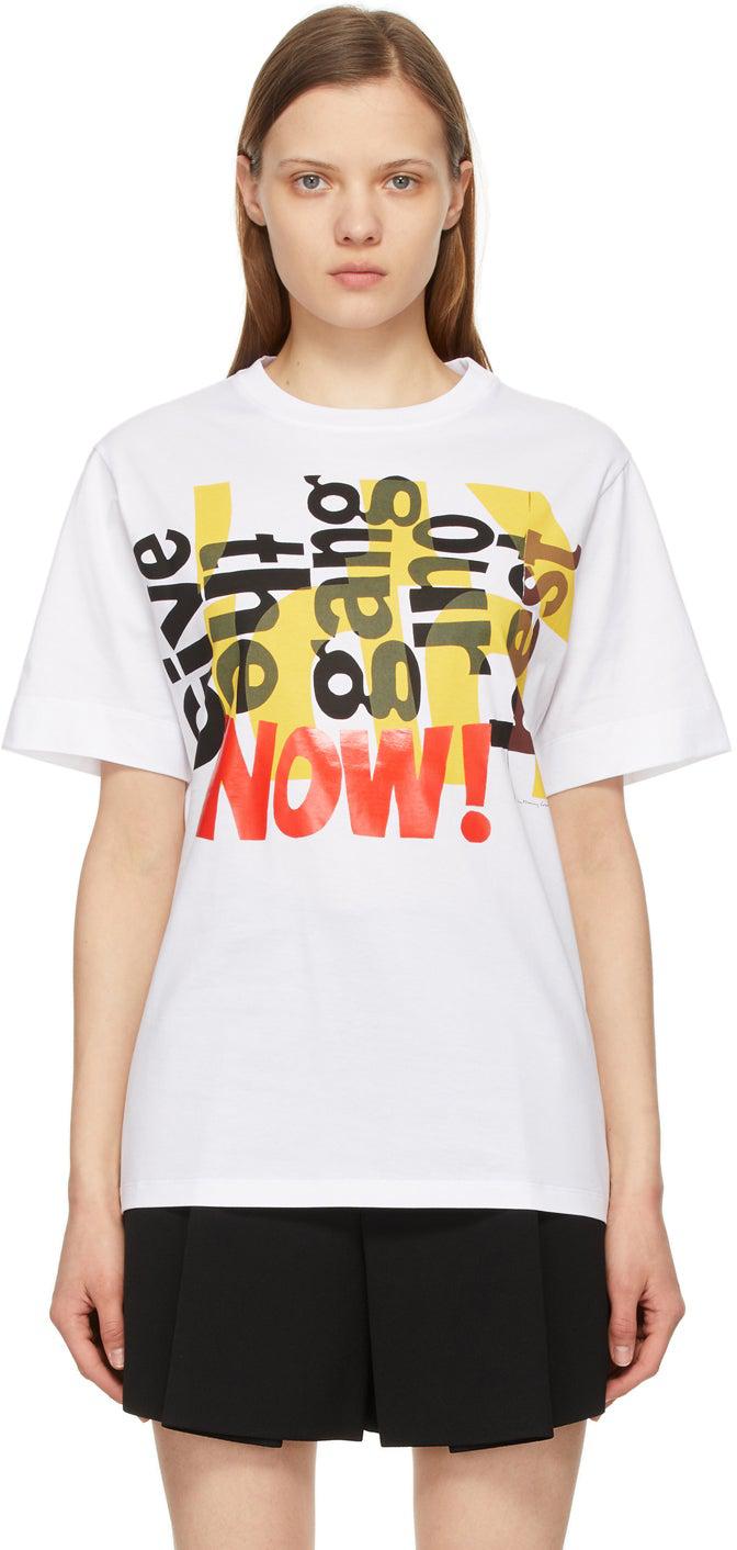 Short sleeve cotton jersey T-shirt in white. Rib knit crewneck collar. Text printed in black, yellow, and red at front. Logo printed in black at back collar. Part of the Chloé x Corita Kent collaboration. Supplier color: White 100% cotton. Brand: Chloé