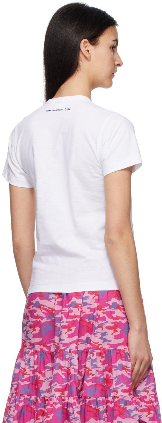 Short sleeve cotton jersey T-shirt in white. Rib knit crewneck collar. Graphic printed in black and red at front. Logo printed in black at back collar. Part of the Comme des Garçons Girl x Disney collaboration. Supplier color: White 100% cotton. Brand: Comme des Garçons Girl
