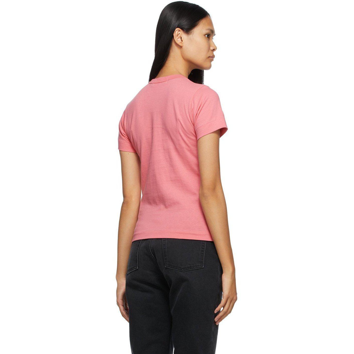 Short sleeve cotton jersey T-shirt in pink. Rib knit crewneck collar. Signature embroidered graphic appliqué in red, white, and black at chest. Supplier color: Pink 100% cotton. Brand: Comme des Garçons Play