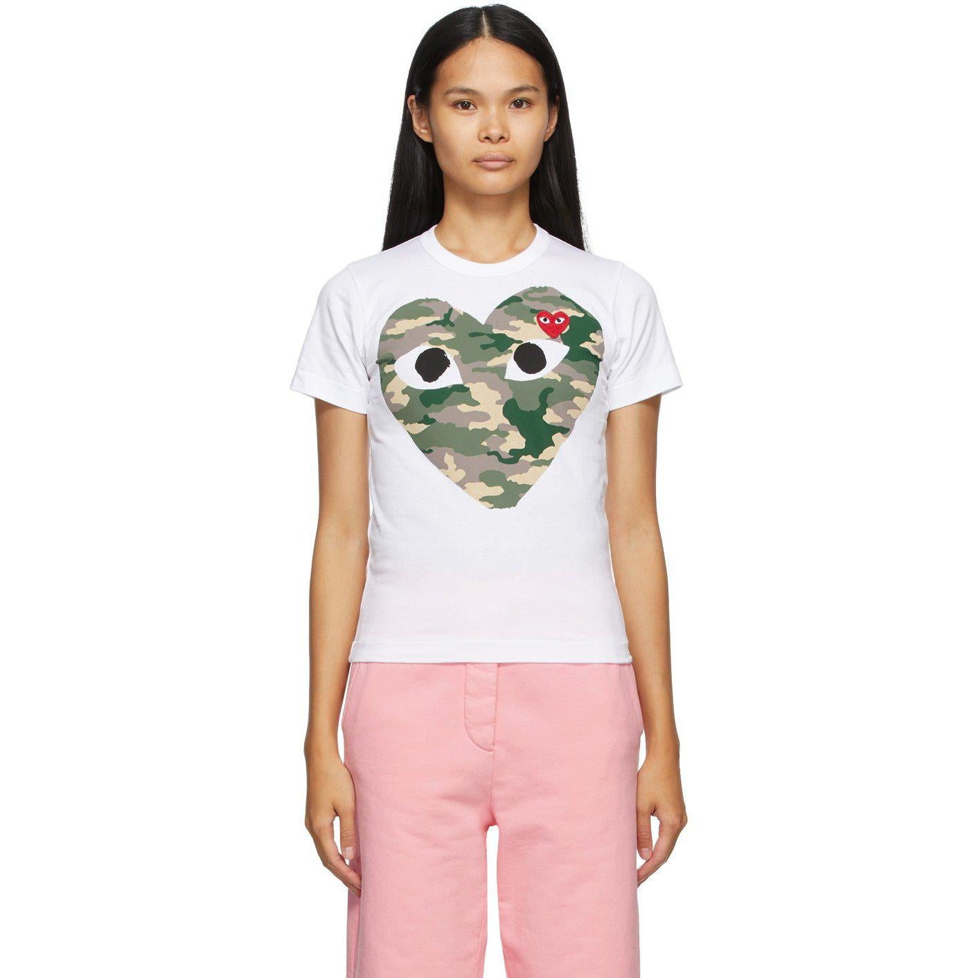 Short sleeve cotton jersey T-shirt in white. Rib knit crewneck collar. Signature embroidered graphic appliqué in red, white, and black at chest. Signature graphic featuring camouflage pattern printed in tones of taupe, beige, and green at front. Supplier color: White 100% cotton. Brand: Comme des Garçons Play