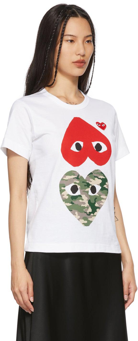 Short sleeve cotton jersey T-shirt in white. Rib knit crewneck collar. Signature embroidered graphic appliqué in red at chest. Signature graphics printed in red and tones of green at front. Supplier color: White 100% cotton. Brand: Comme des Garçons Play