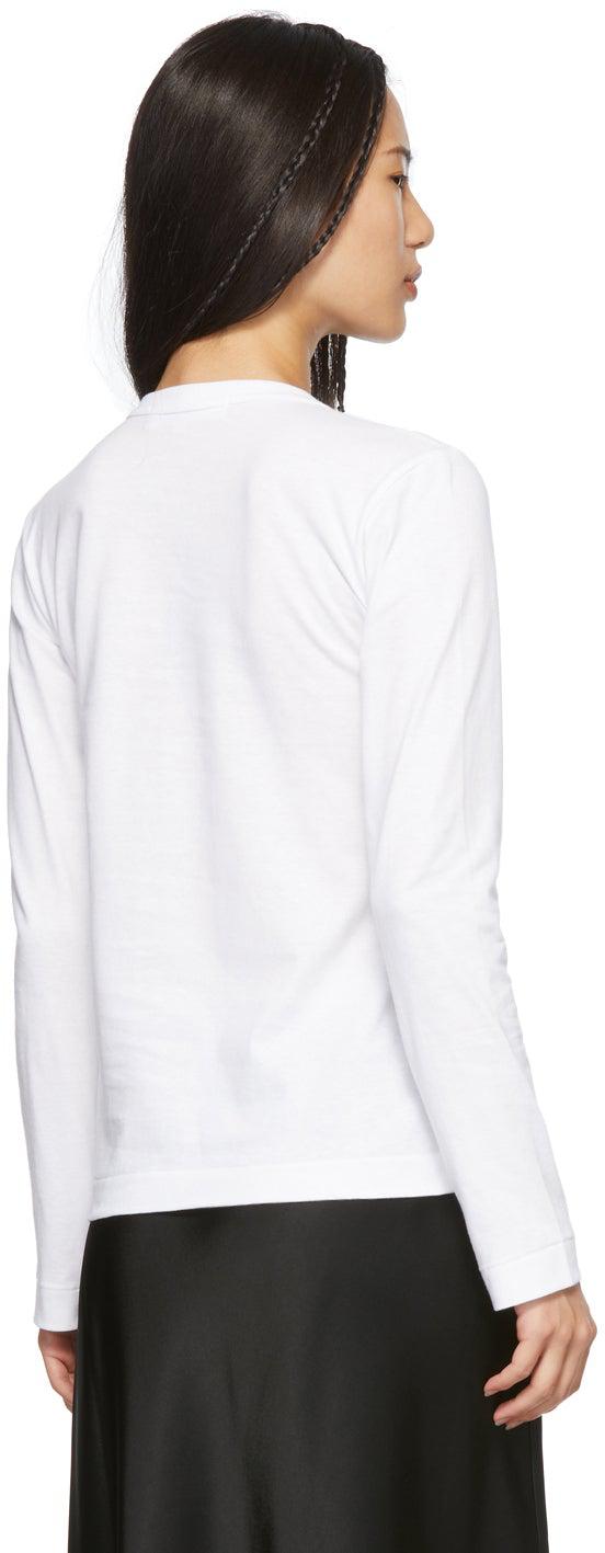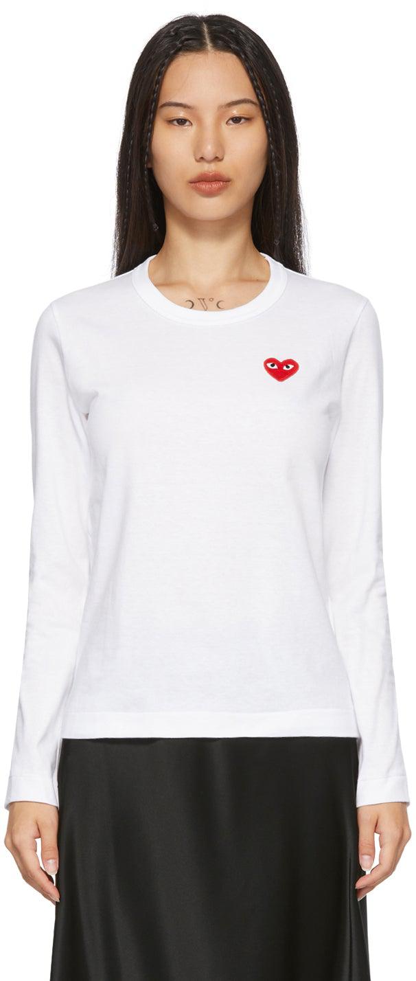 Long sleeve cotton jersey T-shirt in white. Rib knit crewneck collar. Signature embroidered graphic appliqué in red at chest. Supplier color: White 100% cotton. Brand: Comme des Garçons Play