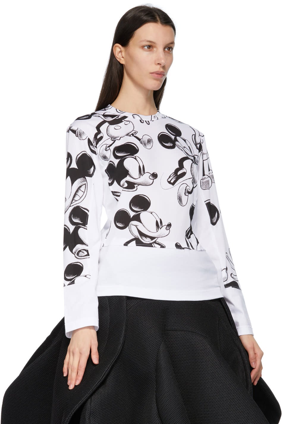 Long sleeve paneled cotton jersey and technical jersey T-shirt in white featuring graphic pattern printed in black. Crewneck collar. Part of the Comme des Garçons x Disney collaboration. Supplier color: White Body 1: 100% polyester. Body 2: 100% cotton. Brand: Comme des Garçons
