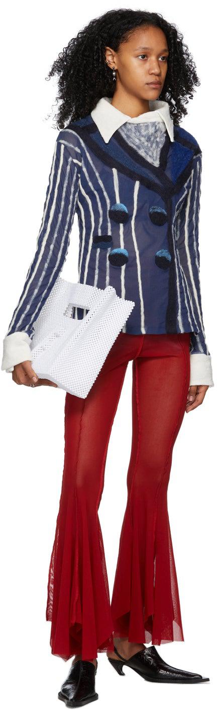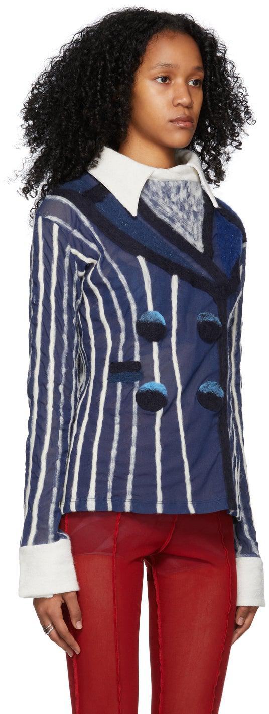 Long sleeve semi-sheer T-shirt in blue featuring merino wool trim in white and blue throughout. Spread collar. Supplier color: Blue Body: 100% polyester. Trim: 100% merino wool. Brand: Feben
