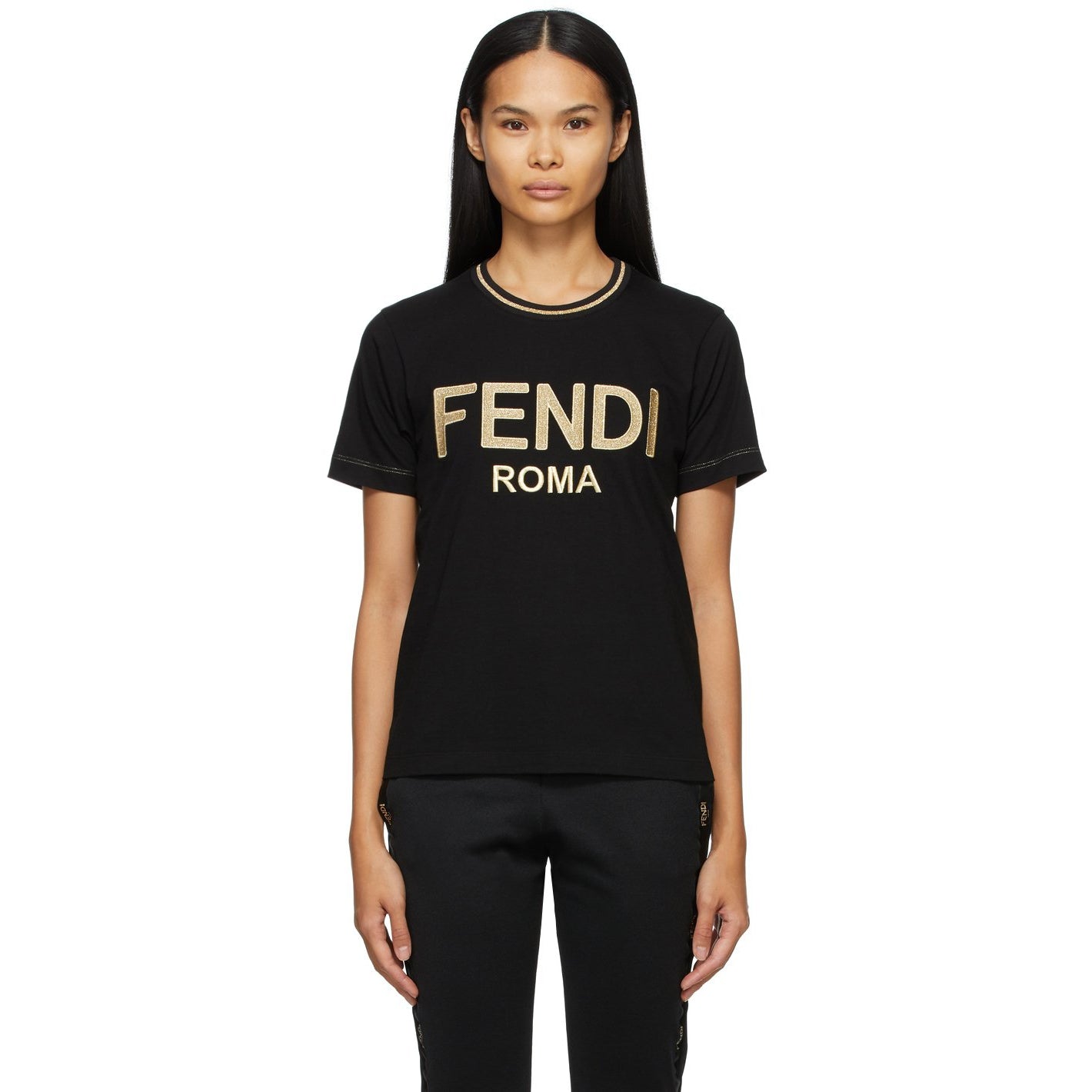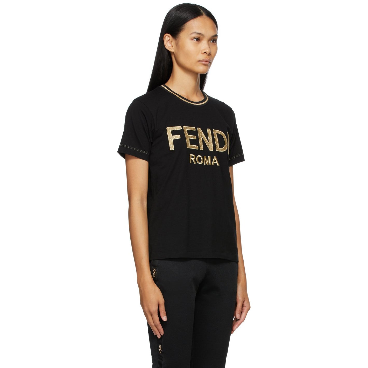 Short sleeve cotton jersey T-shirt in black. Gold-tone stripe at rib knit crewneck collar. Embroidered logo in gold-tone at front. Contrast stitching in gold-tone. Supplier color: Black Body: 100% cotton. Trim: 70% polyester, 27% nylon, 3% elastane. Brand: Fendi