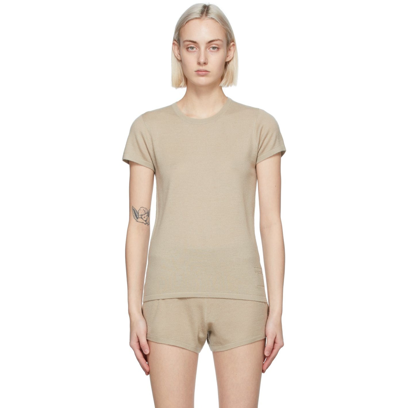 Short sleeve knit cashmere T-shirt in beige. Rib knit crewneck collar and cuffs, and hem. Supplier color: Dark chalk 100% cashmere. Brand: Frenckenberger