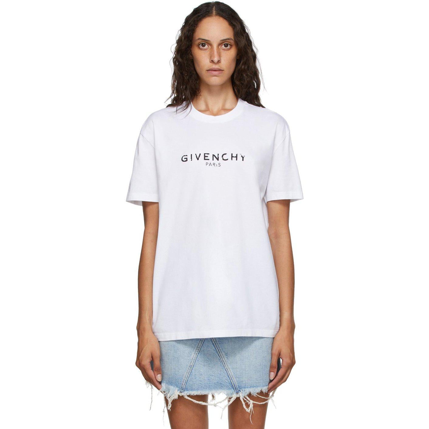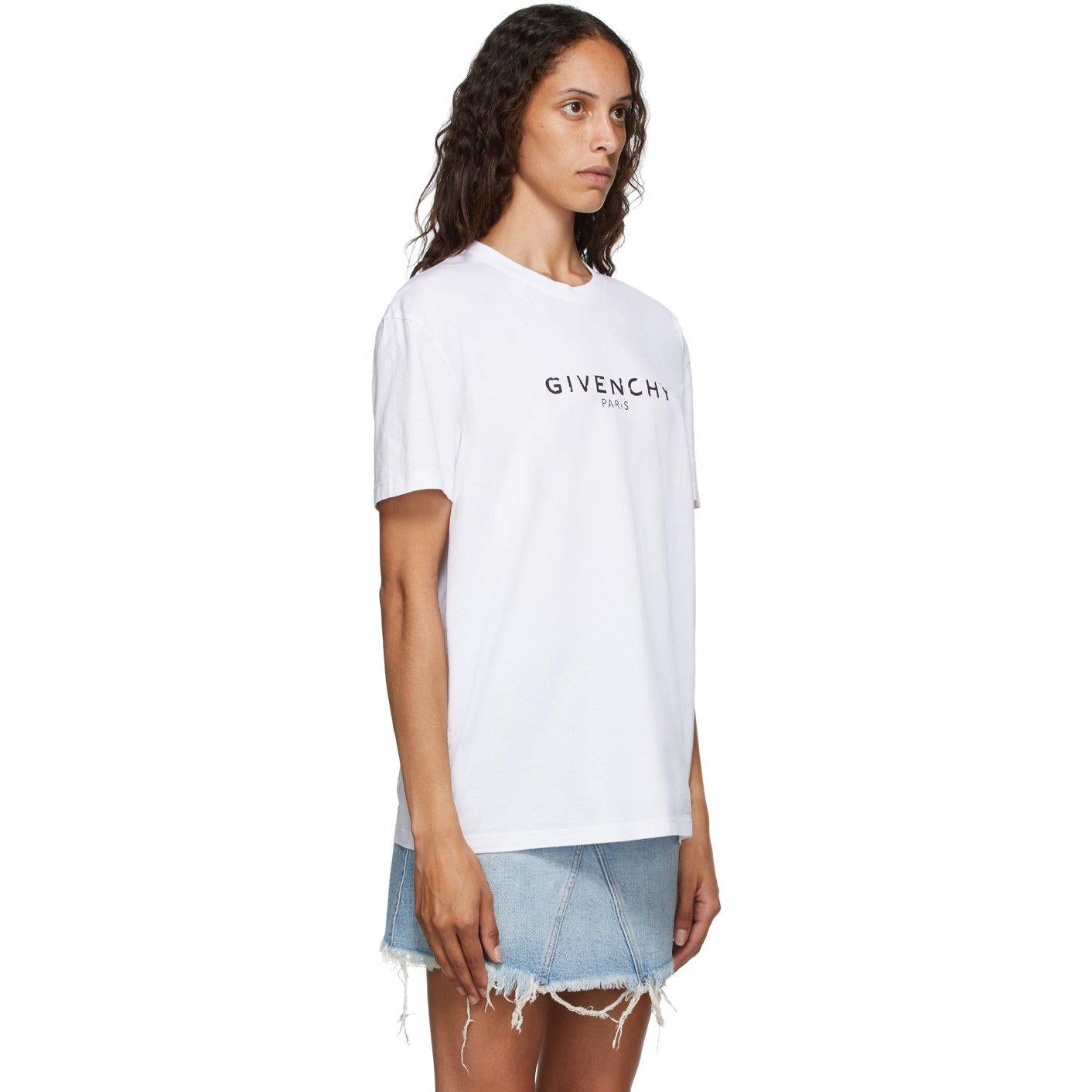 Short sleeve cotton jersey T-shirt in white. Rib knit crewneck collar. Distressed logo printed in black at chest. Supplier color: White 100% cotton. Brand: Givenchy