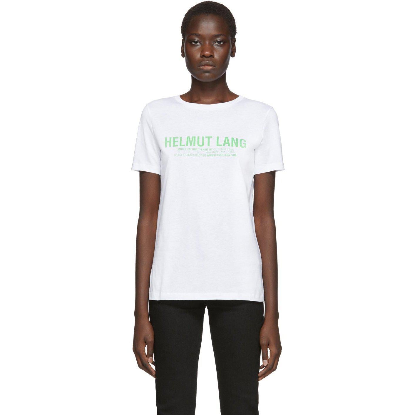 Short sleeve cotton jersey t-shirt in white. Rib knit crewneck collar. Text and logo printed in green at front. Available exclusively at SSENSE. Supplier color: White/Poison 100% cotton. Brand: Helmut Lang