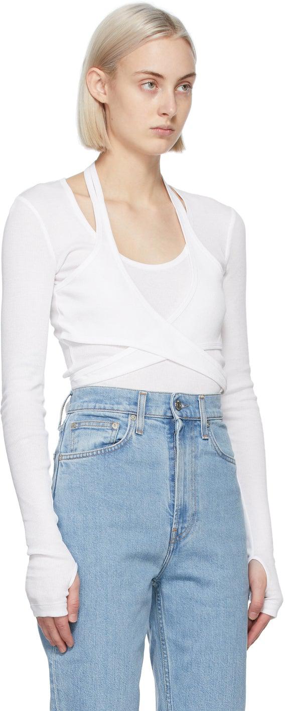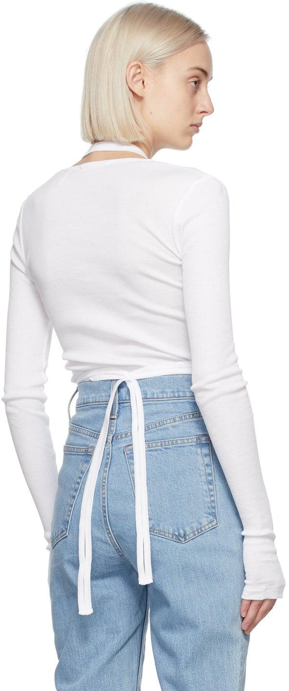 Long sleeve rib knit cotton T-Shirt in white. Scoop neck collar. Bikini-style overlay with halter neck, criss-crossing panels, and self-tie fastening. Supplier color: Chalk white 100% cotton. Brand: Helmut Lang